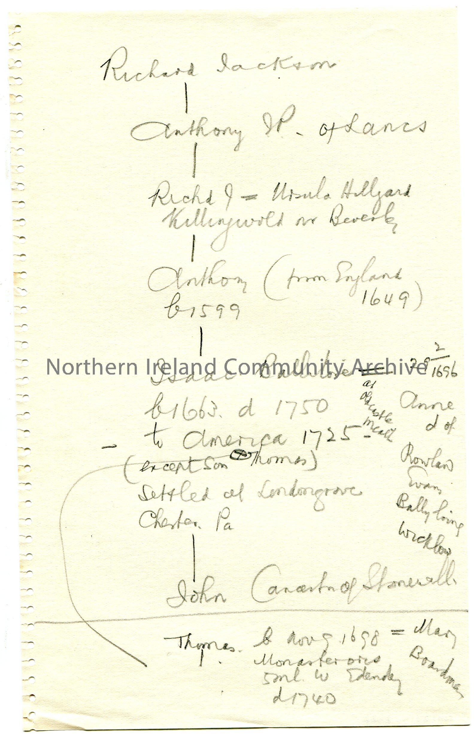 Handwritten family tree re Jacksons. Begins with Richard Jackson.