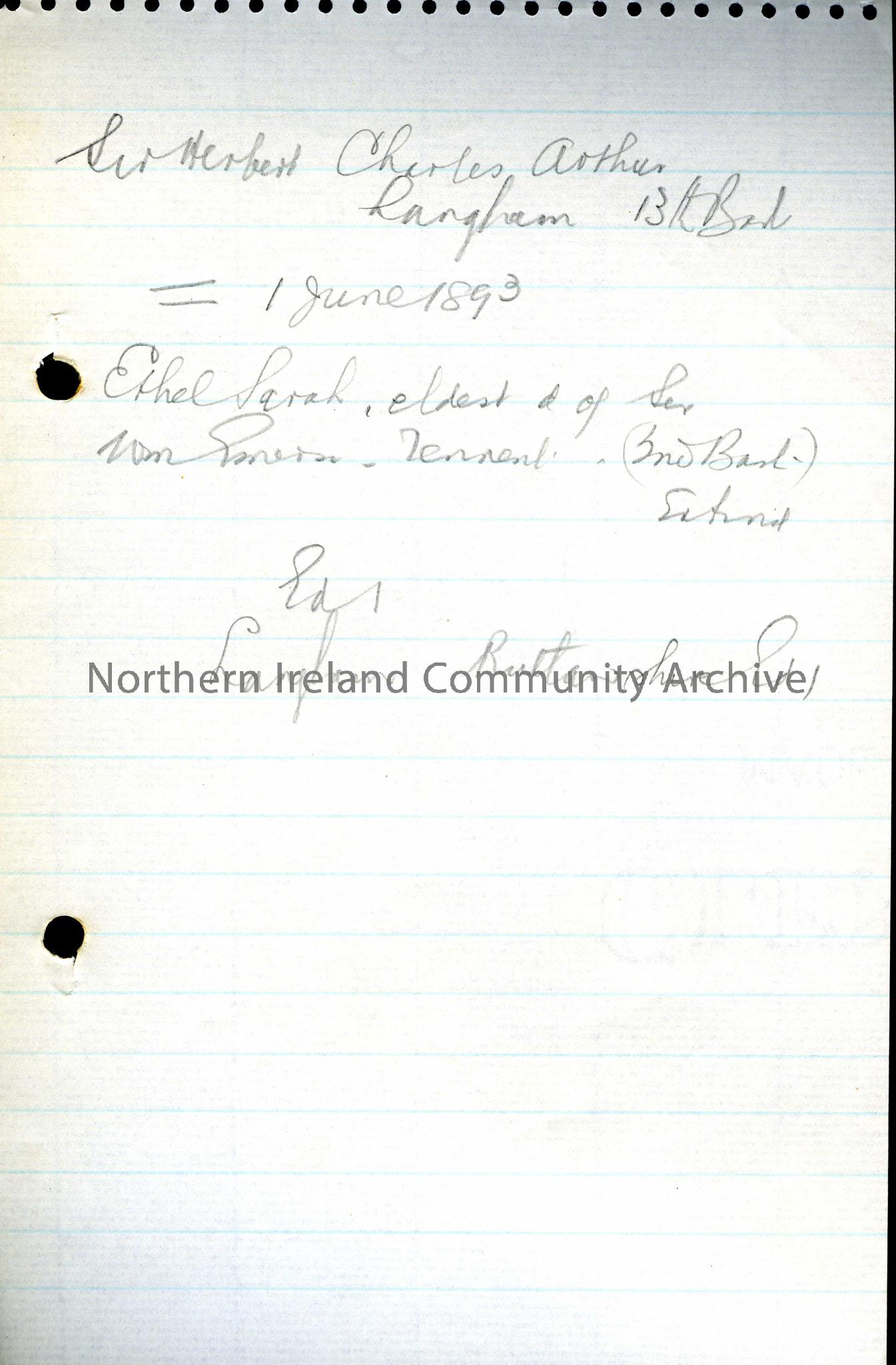 Handwritten genealogical note on Sir Herbert Charles Arthur Langham, 13th Bart.