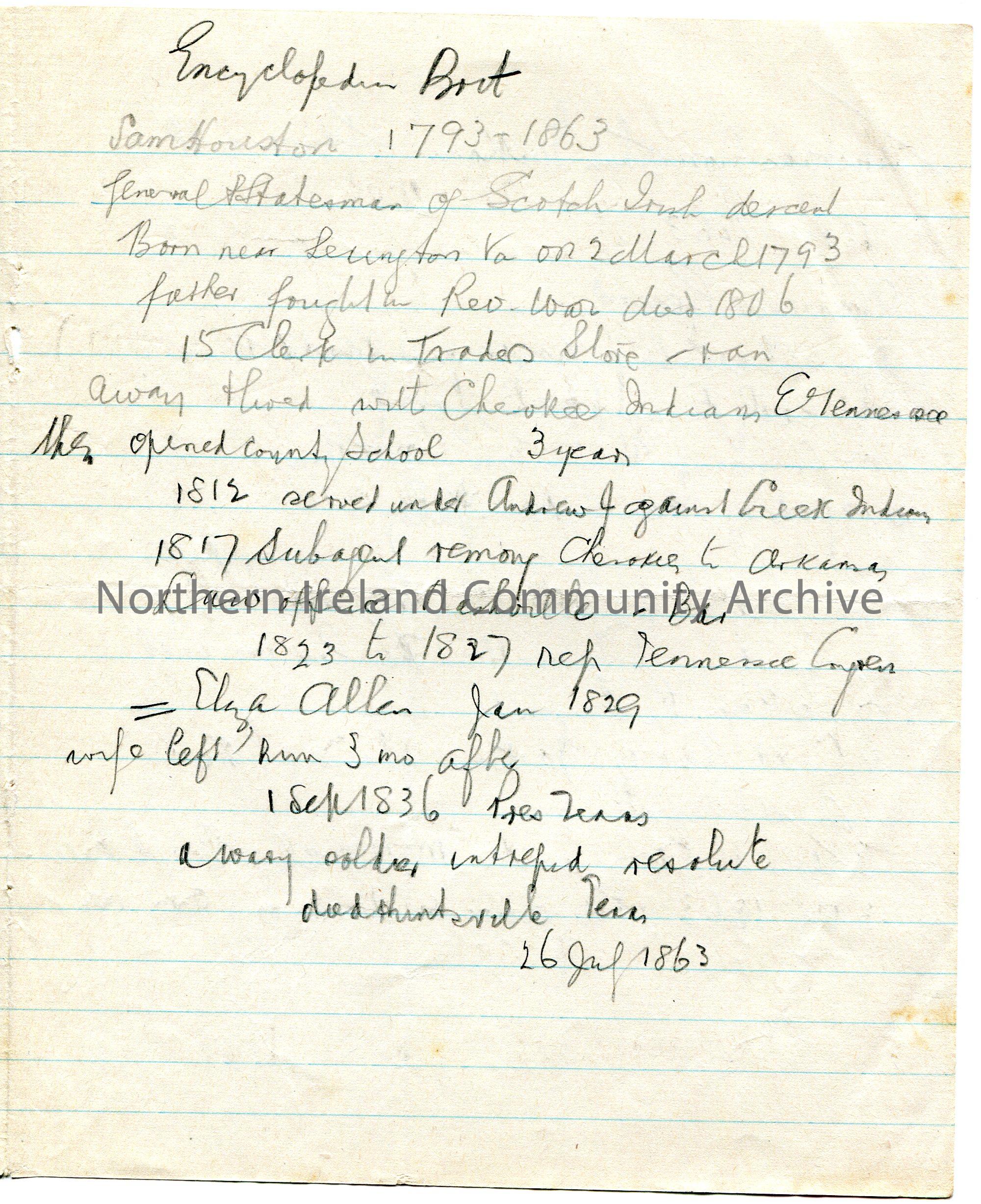 Handwritten genealogical notes on folded lined paper re Thomas Jonathan Jackson Stonewall 1824-1863 and Sam Houston 1793-1863. – scan073b