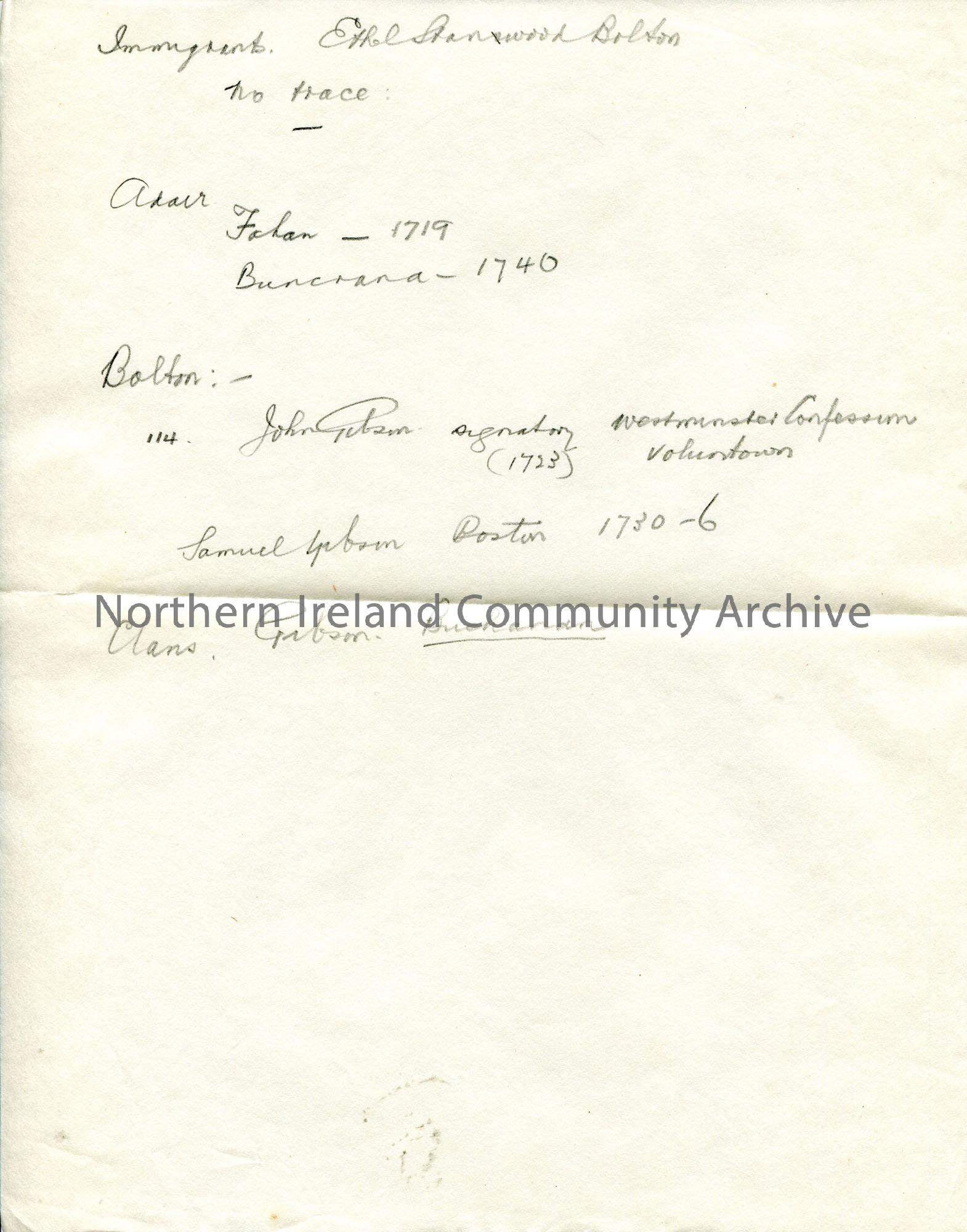 Handwritten genealogy notes re Gibson - Buchanan links. Part of Sam's research for James E. Gibson, Pennsylvania.