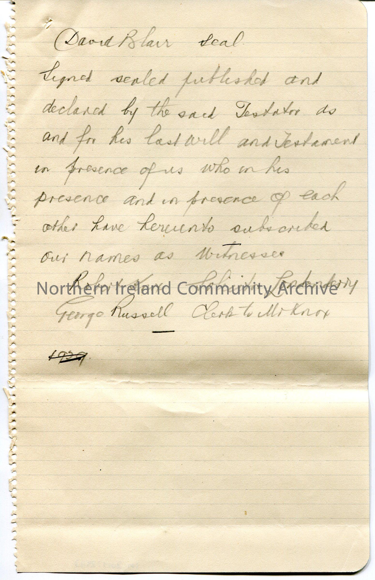 Handwritten (in pencil on lined paper) version of the witnesses of the last will and testament of David Blair. Witnesses signed as Robert Knox, Solicitor of Londonderry and George Russell, Clerk to Mr Knox.