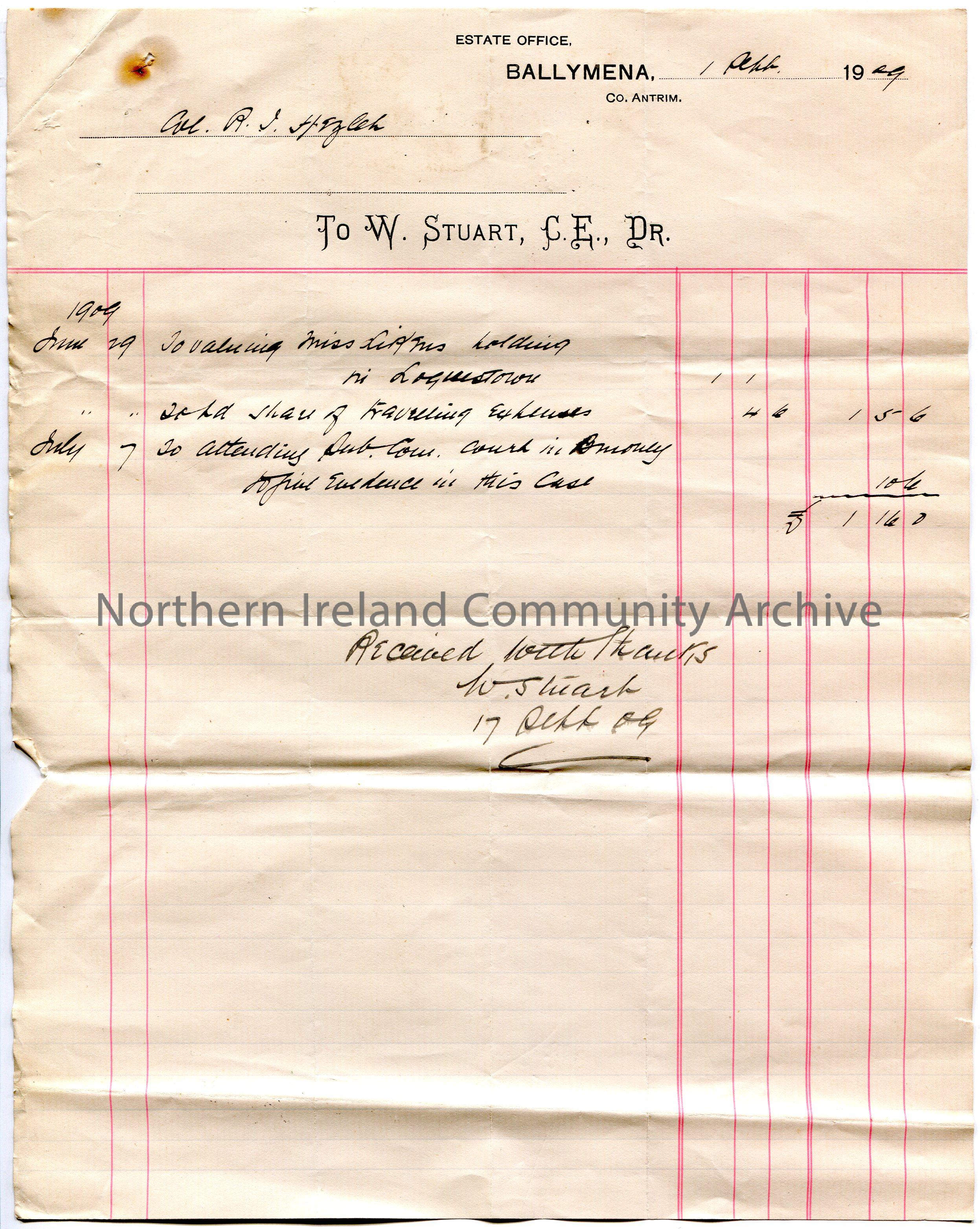 Handwritten invoice for Col. R J Hezlet from W Stuart, C.E. Ballymena, County Antrim. Dated 1st September, 1909. For months June and July 1909. For valuation of Miss ? holding in Loguestown, travelling expenses and attending a court 'to give evidence in this case'. Total sum of £1.16.0. Signed received with thanks, W. Stuart. Dated 17th October, 1909.