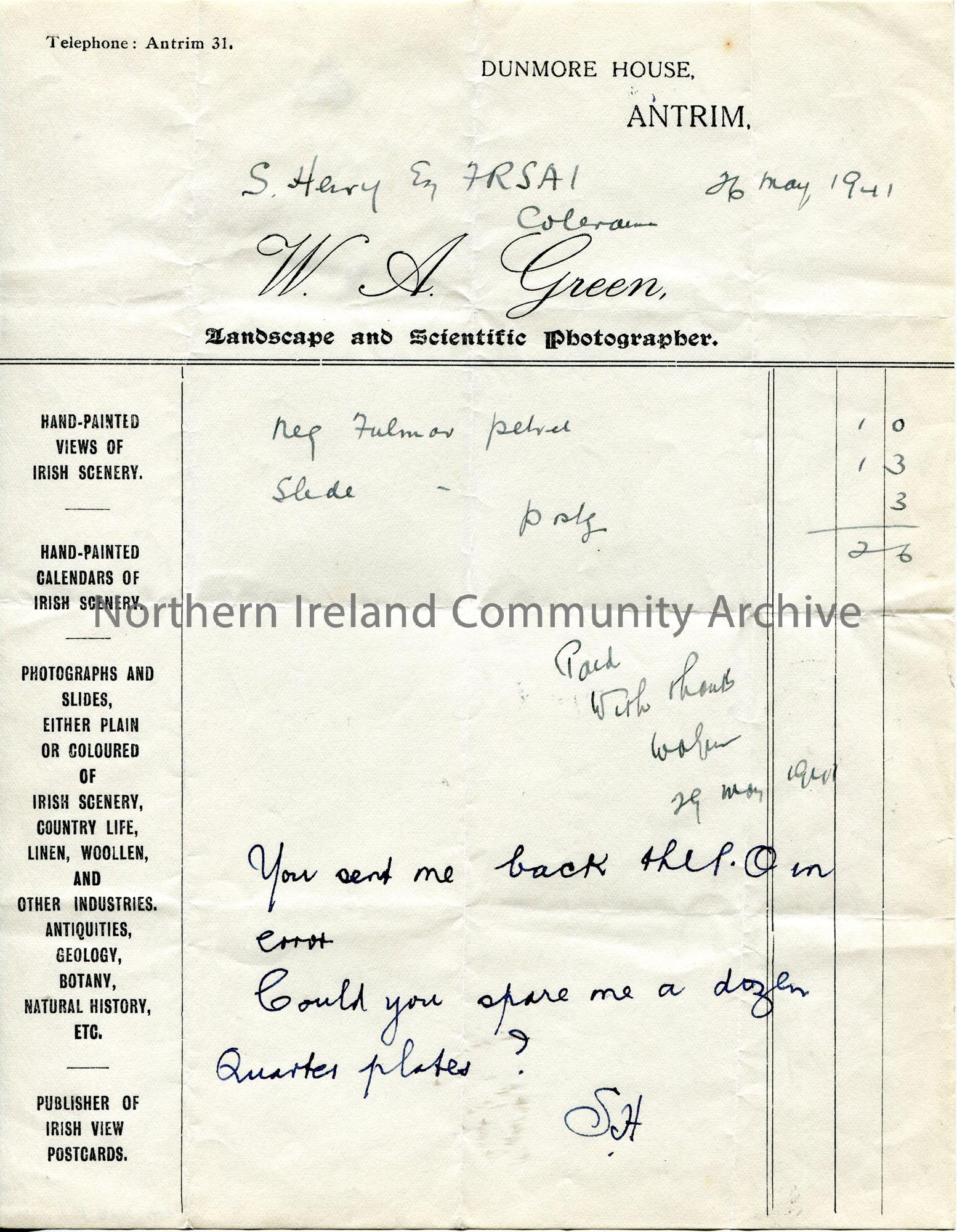 Handwritten invoice on headed paper for Sam Henry to pay W. A. Green, photographer. Dated 26th May 1941. For an image of a fulmar petrel [bird], slide and postage totalling £0.2.6. Handwritten note from Sam for sending something in error and if he could have some quarter plates.