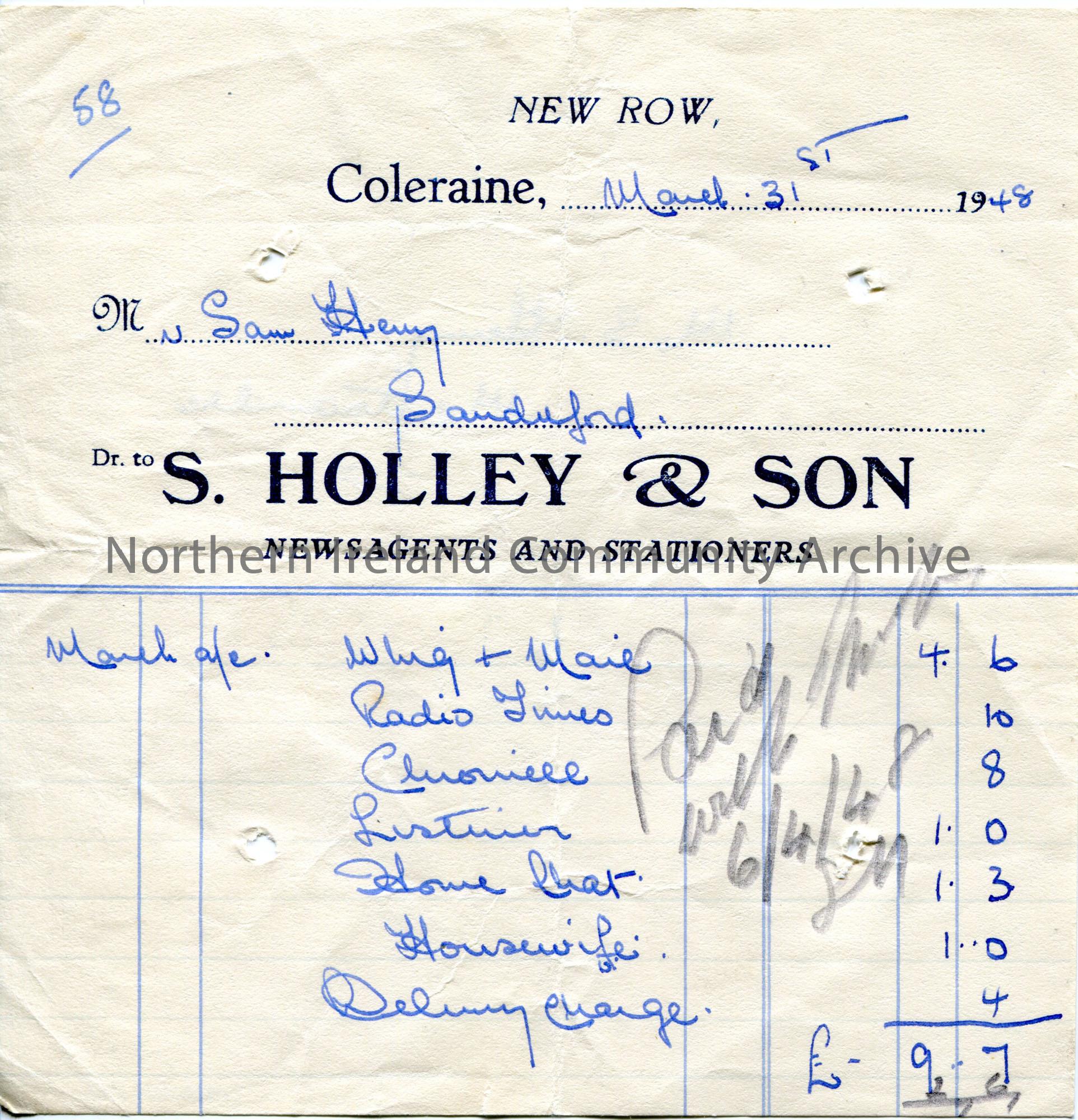 Handwritten invoice to Sam Henry from Sam Holley, newsagents and stationers. Dated 31st March 1948. For payment of goods for the month of March consisting of newspapers and magazines - Whig, Mail, Radio Times, Chronicle, Listener, Home Chat, Housewife. Totalling £0.9.7.