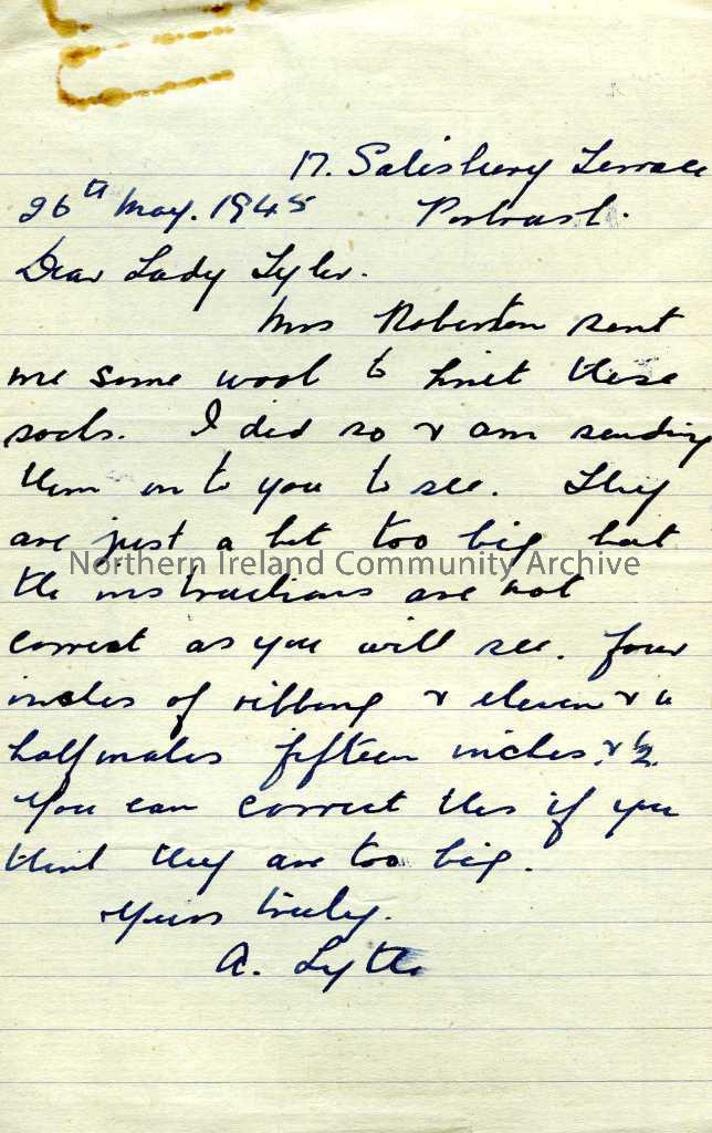 Handwritten letter addressed to Lady Taylor from A.Lyttle dated 26th May 1945. Addressed from 17 Salisbury Terrace, Portrush. Letter is regarding socks that A.Lyttle has knit which she is sending for Lady Taylor to see.