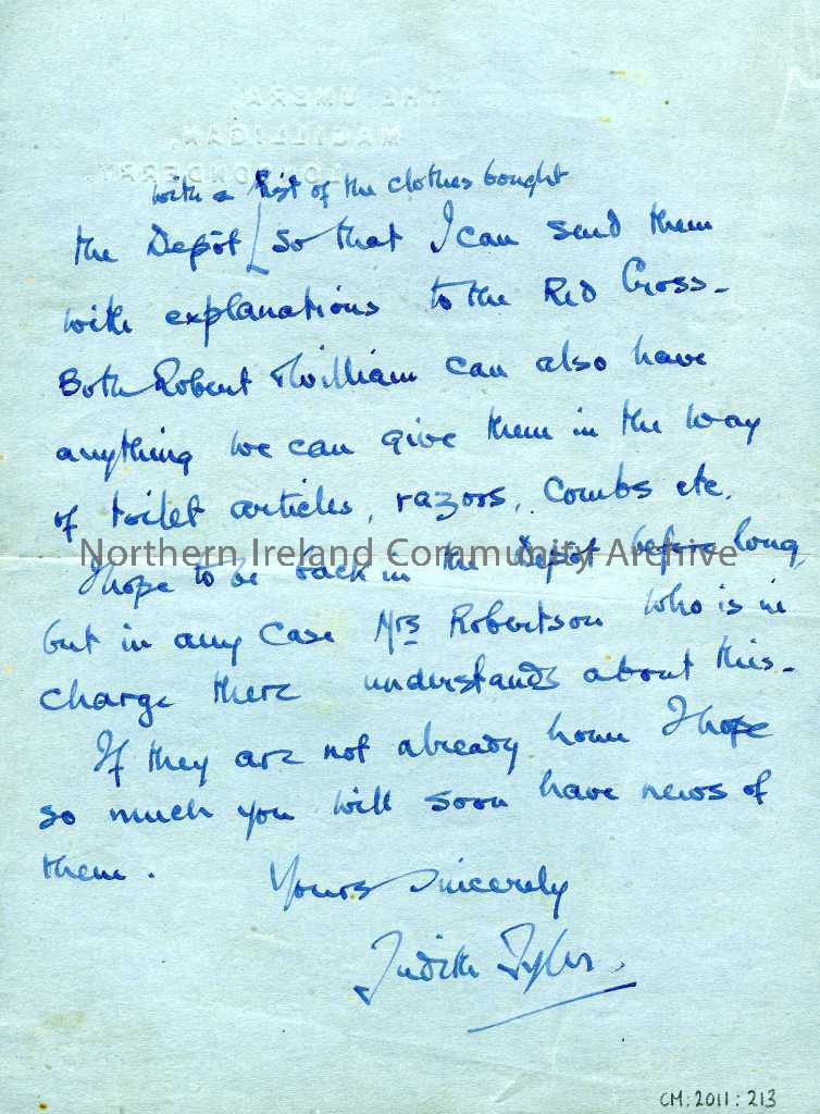 Handwritten letter addressed to Mrs McIlreavy from Lady Taylor dated 25th May 1945. Address of the sender is indented in the paper - 'The Umbra, Magilligan, Londonderry'. Letter is regarding the return of Mrs McIlreavy's sons, Robert and William and the parcel and coupons which are at the depot for the men.