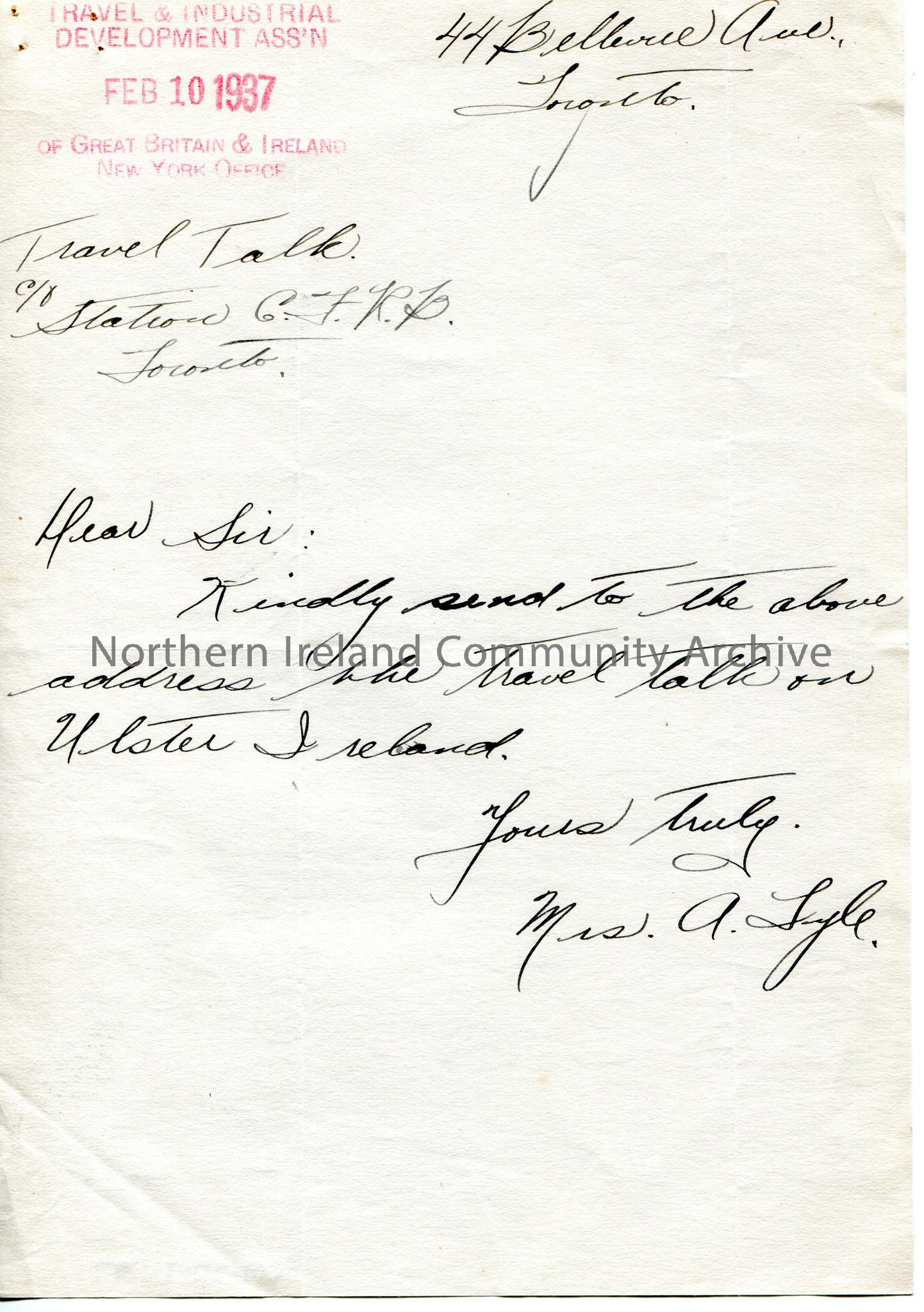Handwritten letter asking for a copy of the Travel talk on Ulster and Ireland from CFRB. Stamped Travel & Tourism Development Ass'n, 10th February, 1937, of Great Britain & Ireland New York Office.