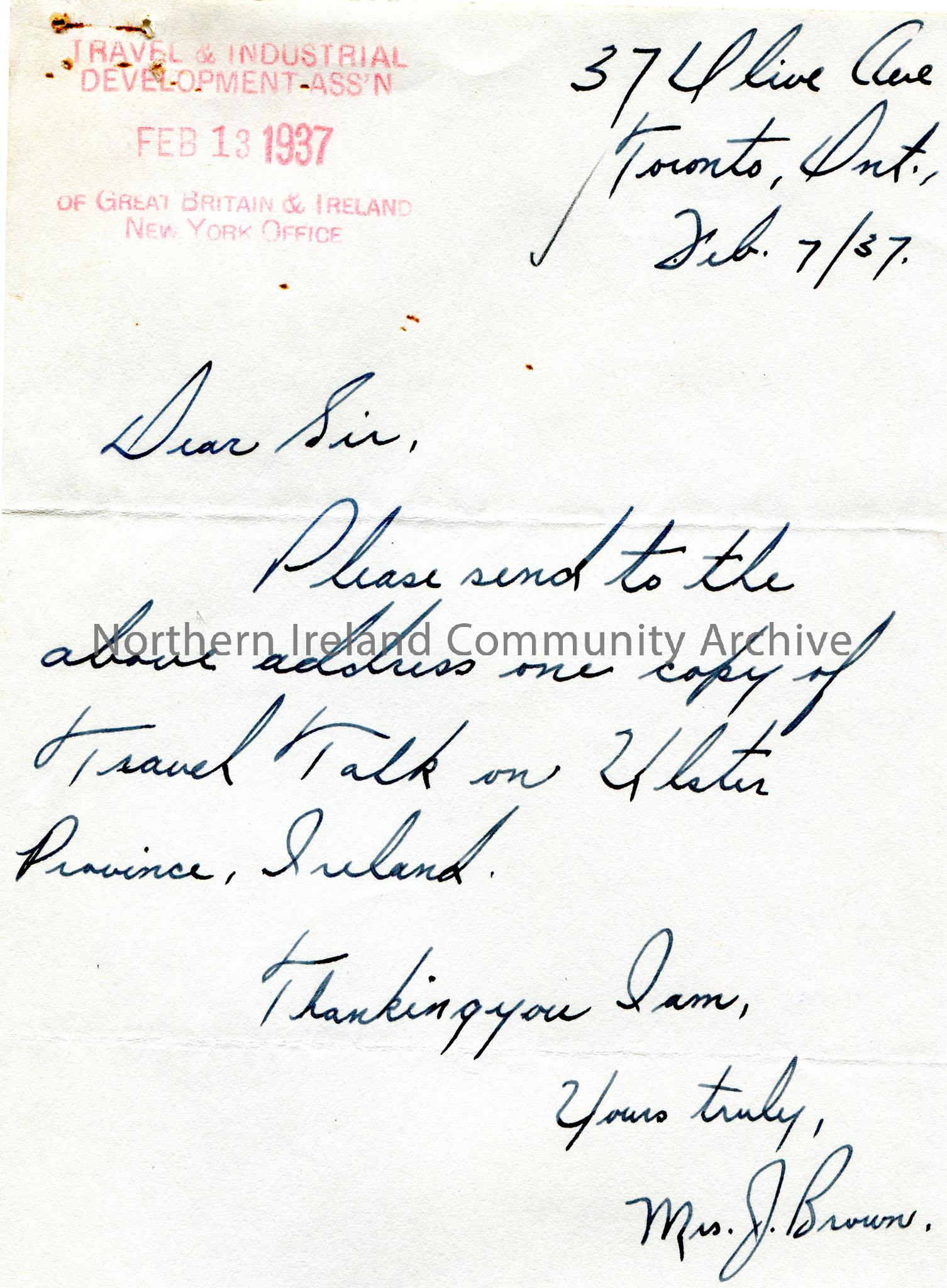 Handwritten letter asking for a copy of the Travel Talk on Ulster. Stamped Travel & Tourism Development Ass'n, 13th February, 1937, of Great Britain & Ireland New York Office.