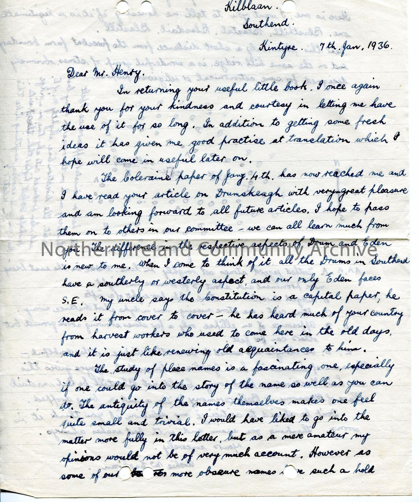 Handwritten letter - author's uncle reads Constitution and 'has heard much of your country' from harvest workers who used to cross to Scotland to work. More discussion on placenames, derivation and meaning - bows to Sam's excellence. Asks for opinion on one that is bothering him - small hand-drawn terrain map included
