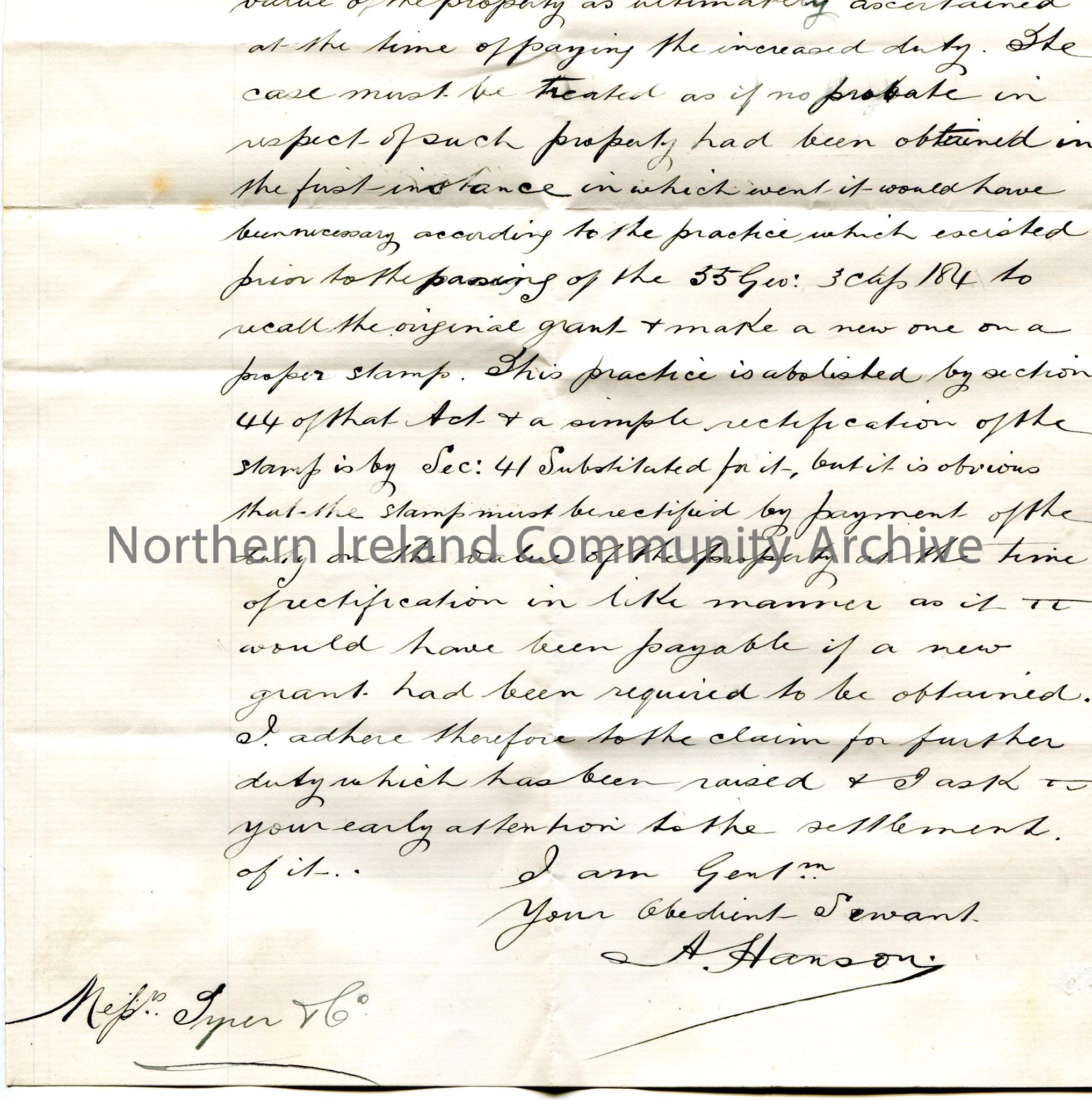 Handwritten letter (copy) to Tyrer, Kenion, Tyrer & Simpson. Writing re the stamp duty on the property of the late Mary R. Jenkins.