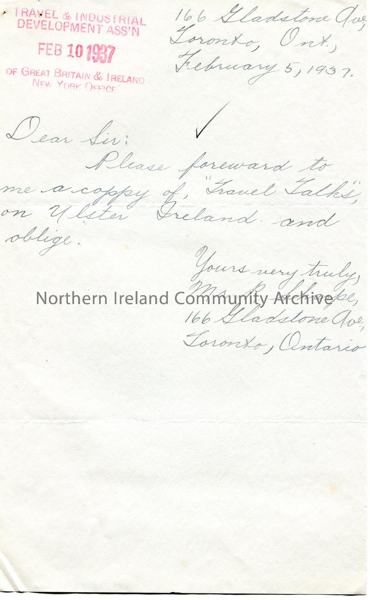 Handwritten letter, dated 5th February, 1937, asking for a copy of 'Travel Talks' on Ulster, Ireland. Stamped Travel & Tourism Development Ass'n, 10th February, 1937, of Great Britain & Ireland New York Office.