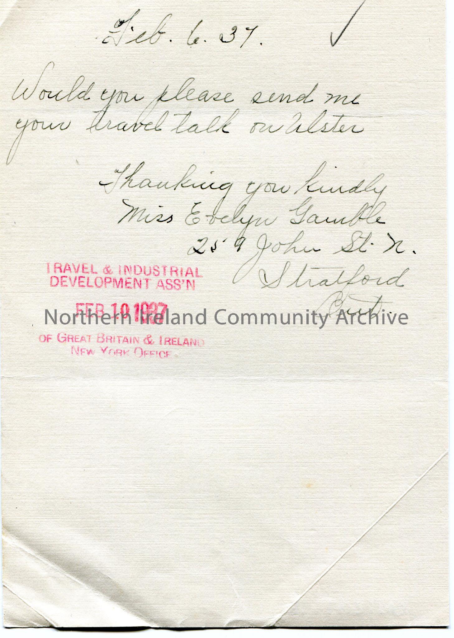 Handwritten letter, dated 6th February, 1937, asking for a copy of the Travel talk on Ulster. Stamped Travel & Tourism Development Ass'n, 10th February, 1937, of Great Britain & Ireland New York Office.