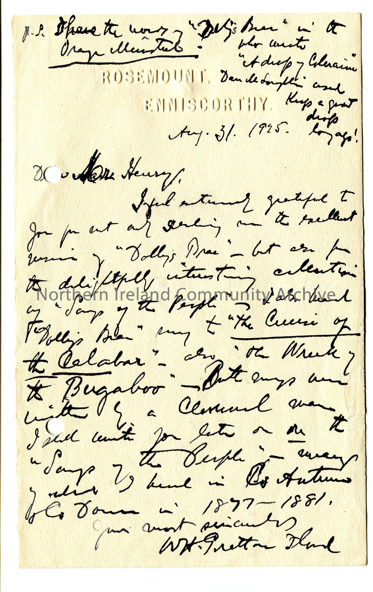 Handwritten letter – difficult to read – refers to Sam’s song collection and ‘the excellent version of Dolly’s Brae’