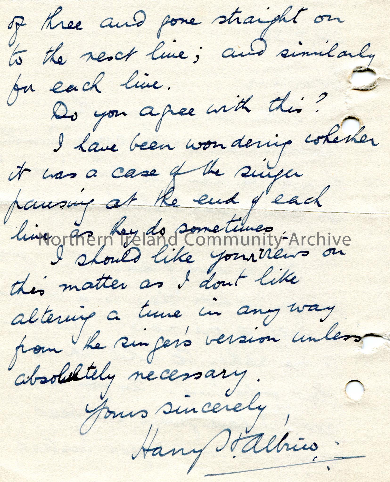 Handwritten letter (double sided) addressed to ‘Dear Sir’. Sends Sam a transcription of song ‘Tumbling through the hay’. Queries the sol-fa version of… – scan058b