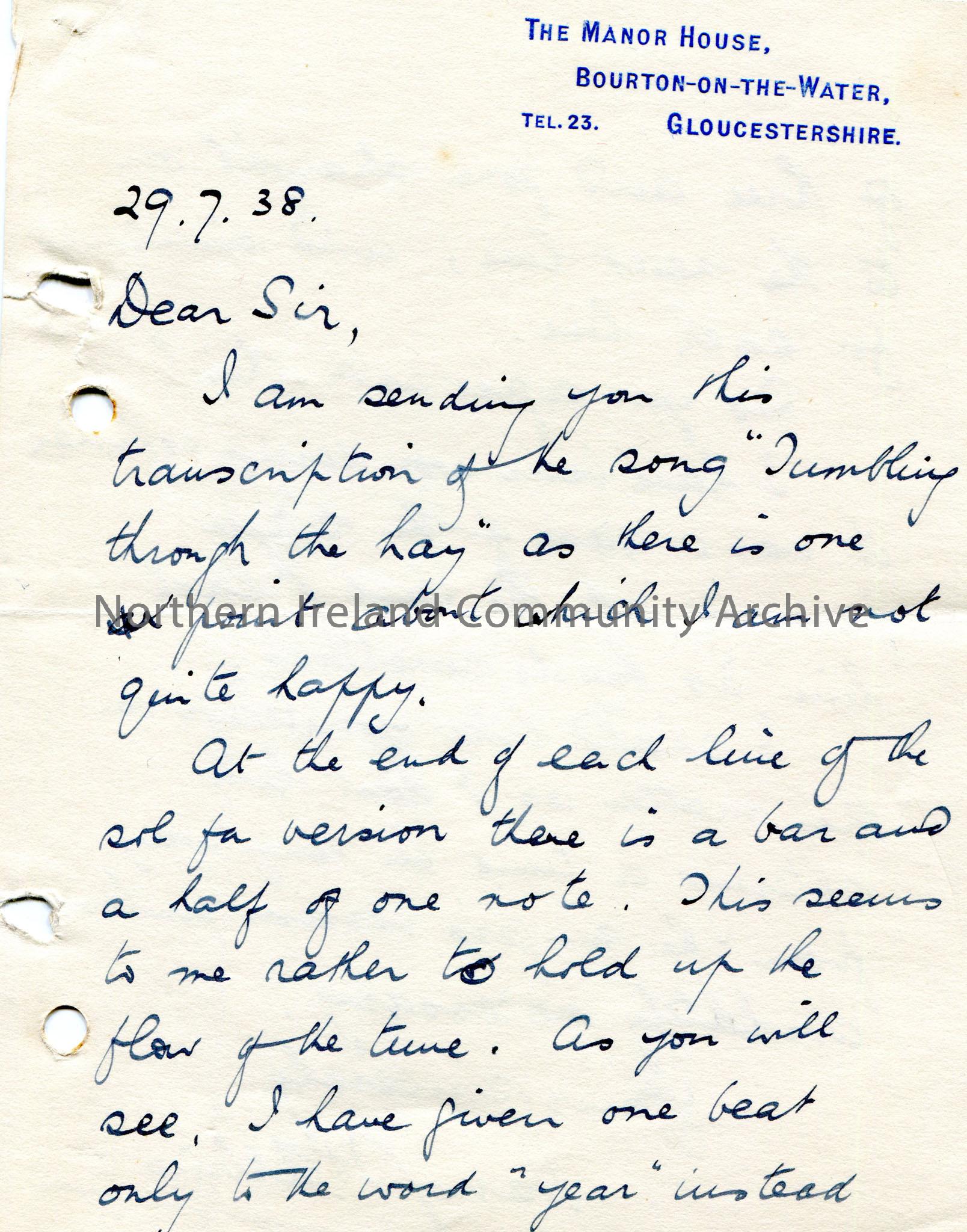 Handwritten letter (double sided) addressed to 'Dear Sir'. Sends Sam a transcription of song 'Tumbling through the hay'. Queries the sol-fa version of the song with Sam.