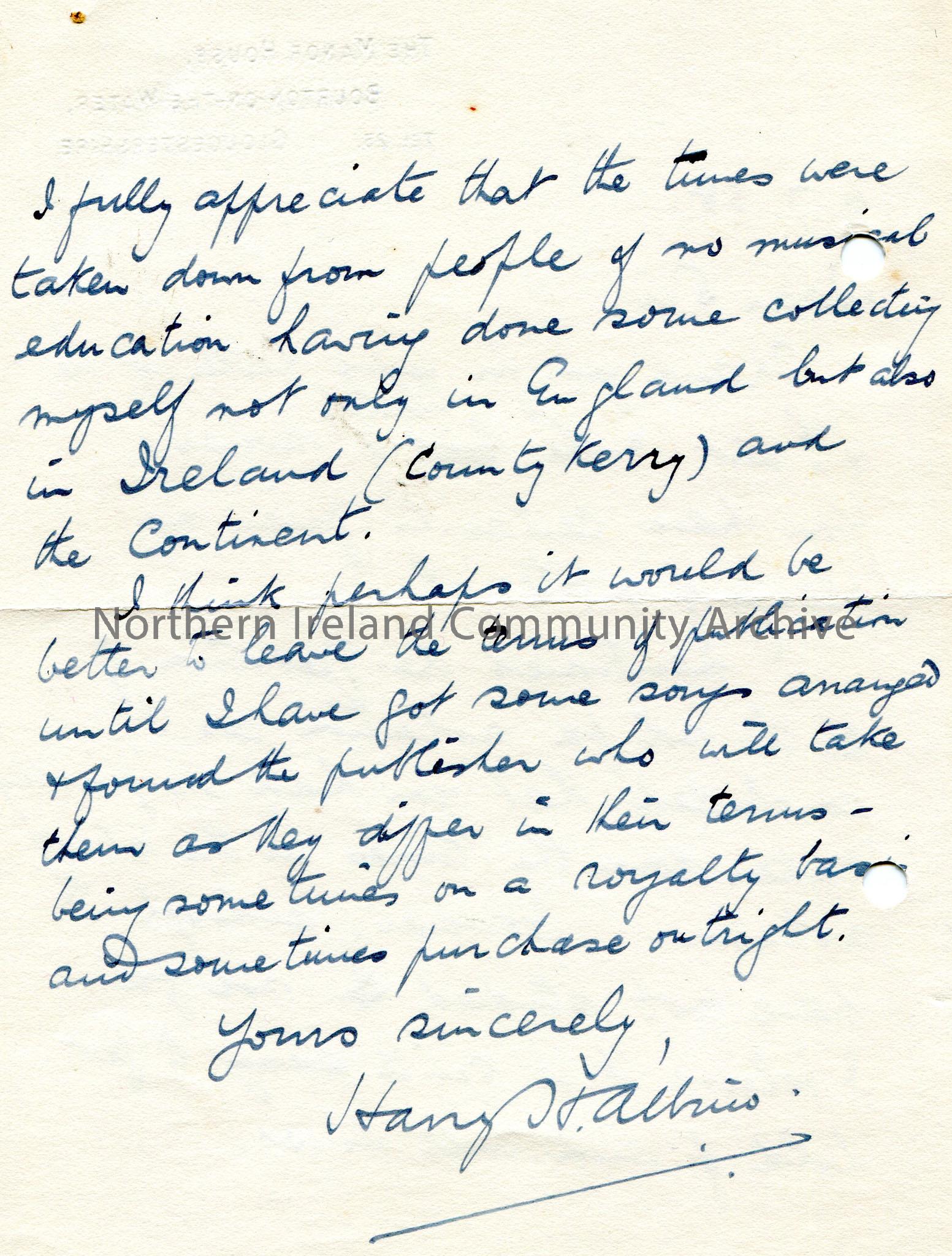 Handwritten letter (double sided) addressed to 'Dear Sir'. Thanks Sam for sending a batch of songs. Mentions sol-fa notation and staff notation of the songs. He has also collected songs in England, County Kerry and the Continent. Writes re the fees if any songs are published.