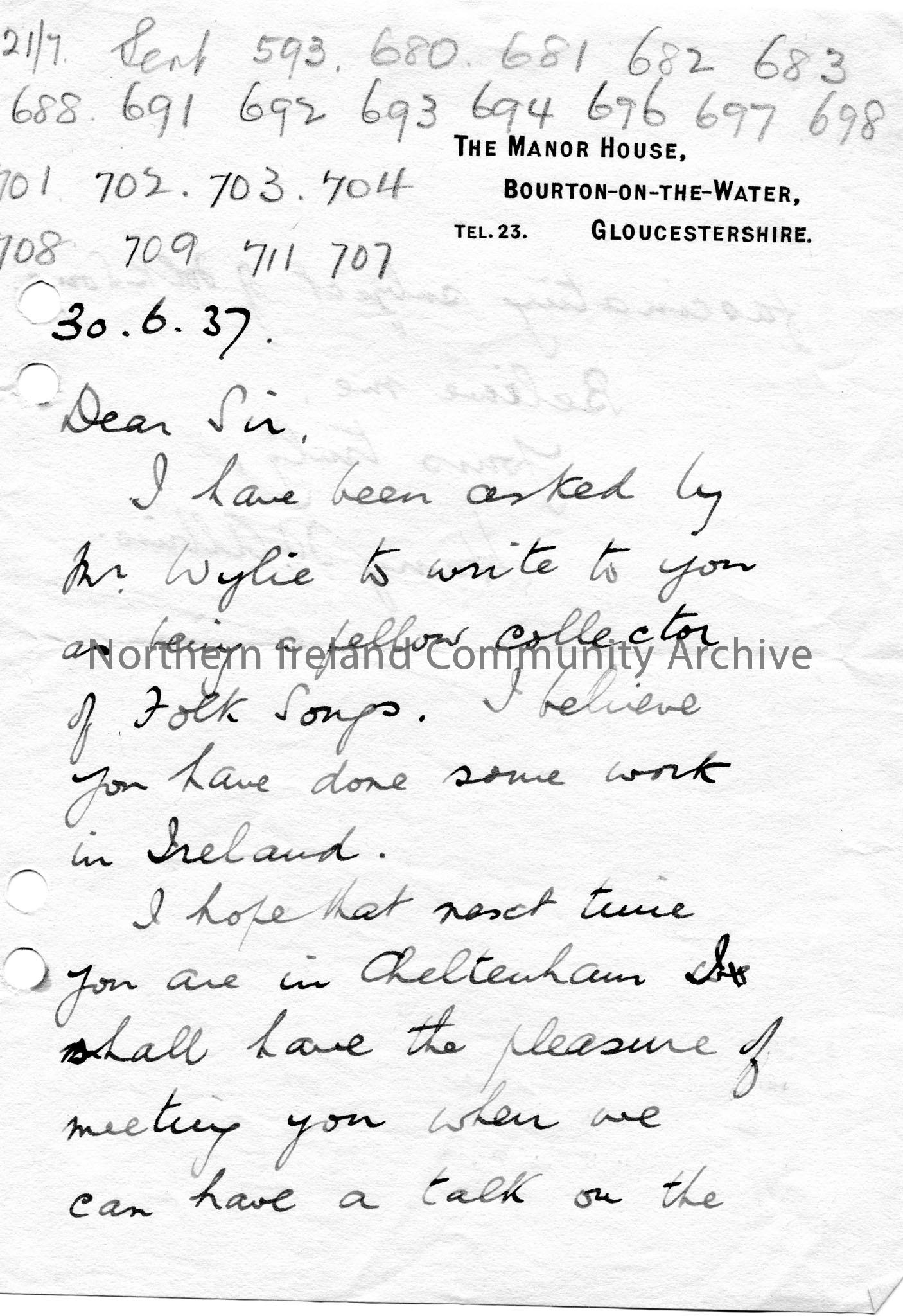 Handwritten letter (double sided) addressed to 'Dear Sir'. They have been asked by Mr Wylie to write to Sam as a 'fellow collector of folk songs'. Hopes to meet Sam in Cheltenham and have a talk on folk songs. Rows of numbers of songs written at top of letter.