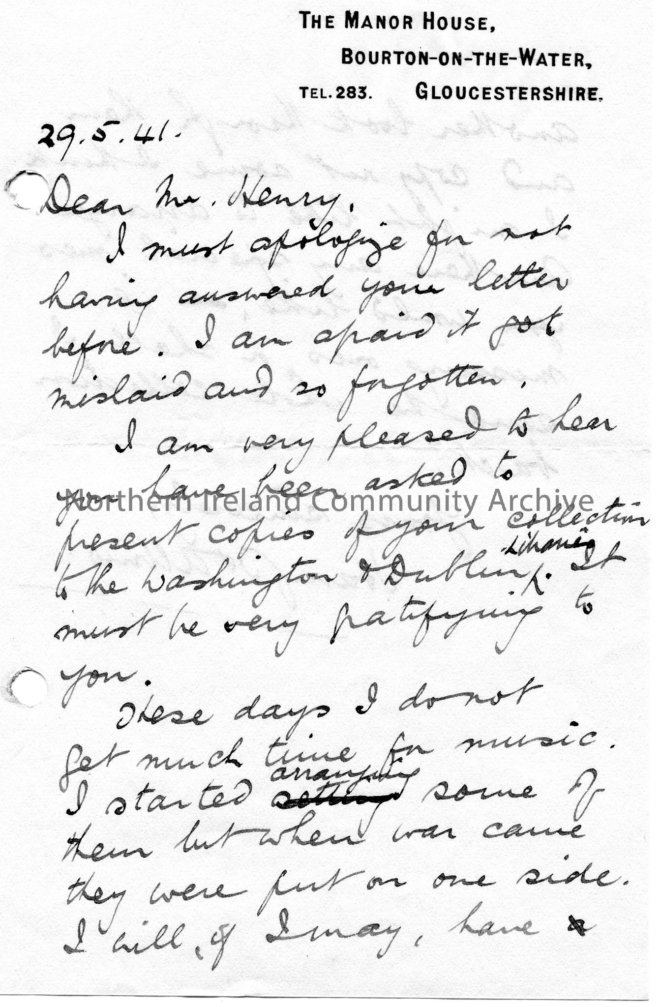 Handwritten letter (double sided) addressed to Mr Henry. Apologises for late reply. Sam has been asked to present to the Washington and Dublin Libraries. He has not had time for music due to the War. Asks Sam if he would like his songs back.