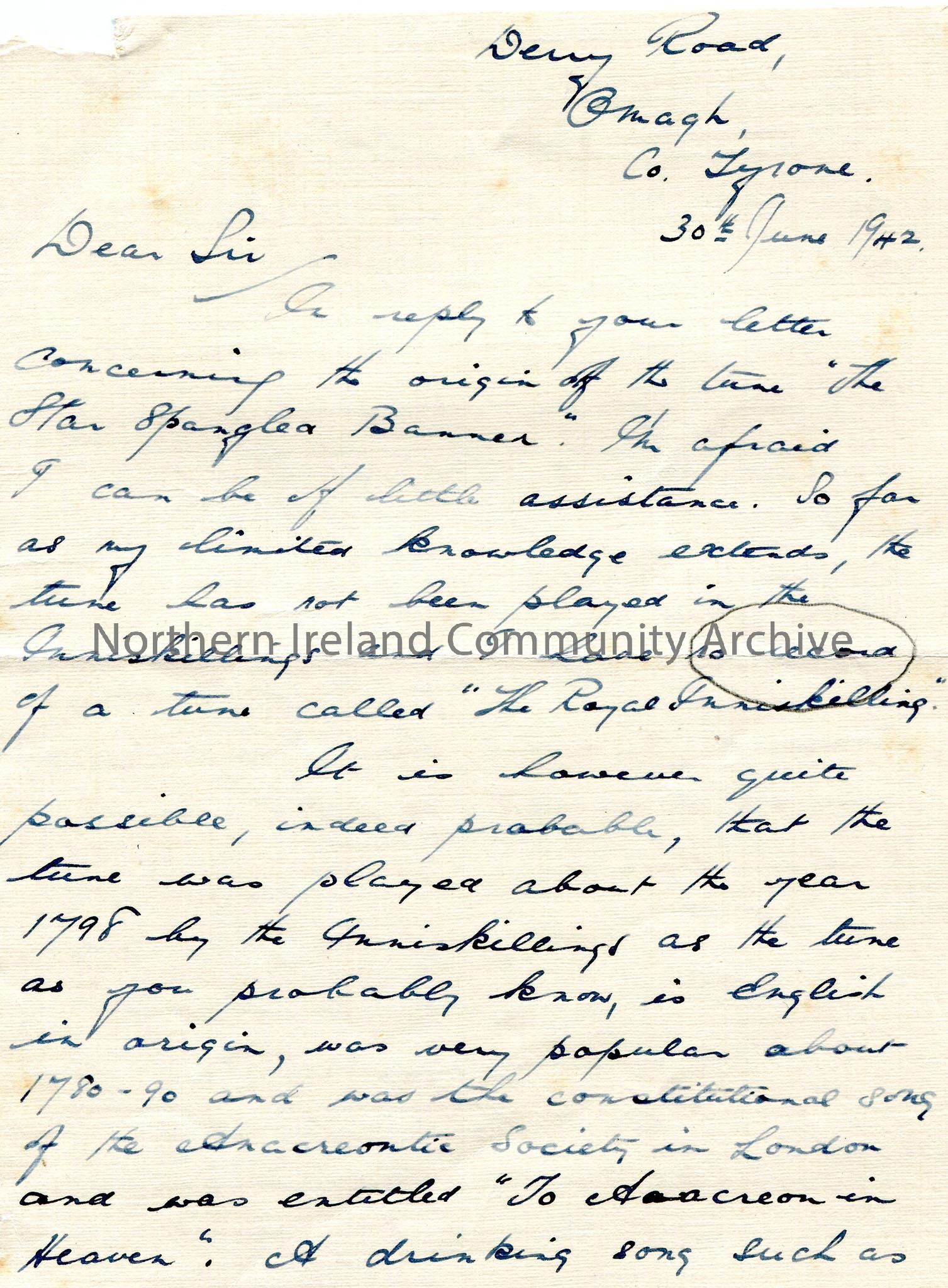 Handwritten letter, double sided, addressed to 'Sir'. Writing re the origin of the tune 'The Star Spangled Banner' in response to Sam's queries. He has found no record of a tune called 'The Royal Inniskilling'. Mentions William Brown, trumpeter in the Inniskillings and Major R M Vaughan, M C Depot Barracks, Omagh, curator of the Regimental Museum.