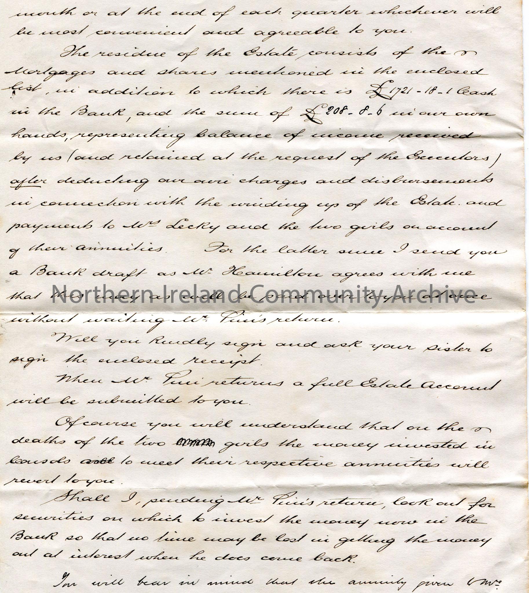 Handwritten letter, double sided and folded, to Miss Hezlet at Bovagh, Aghadowey, Co. Derry. Informs Miss Hezlet that the Executors have passed their Residuary Accounts and paid Legacy Duty of £1543.3.4. Mentions Miss Flora Bevington. The residence is now held in trust for Miss Hezlet and her sister and the securities and investments of the residence will be transferred to them. Details what the residence of the Estate consists of. Comments on the poor health of his wife. Hopes Miss Hezlet and her sister are well.