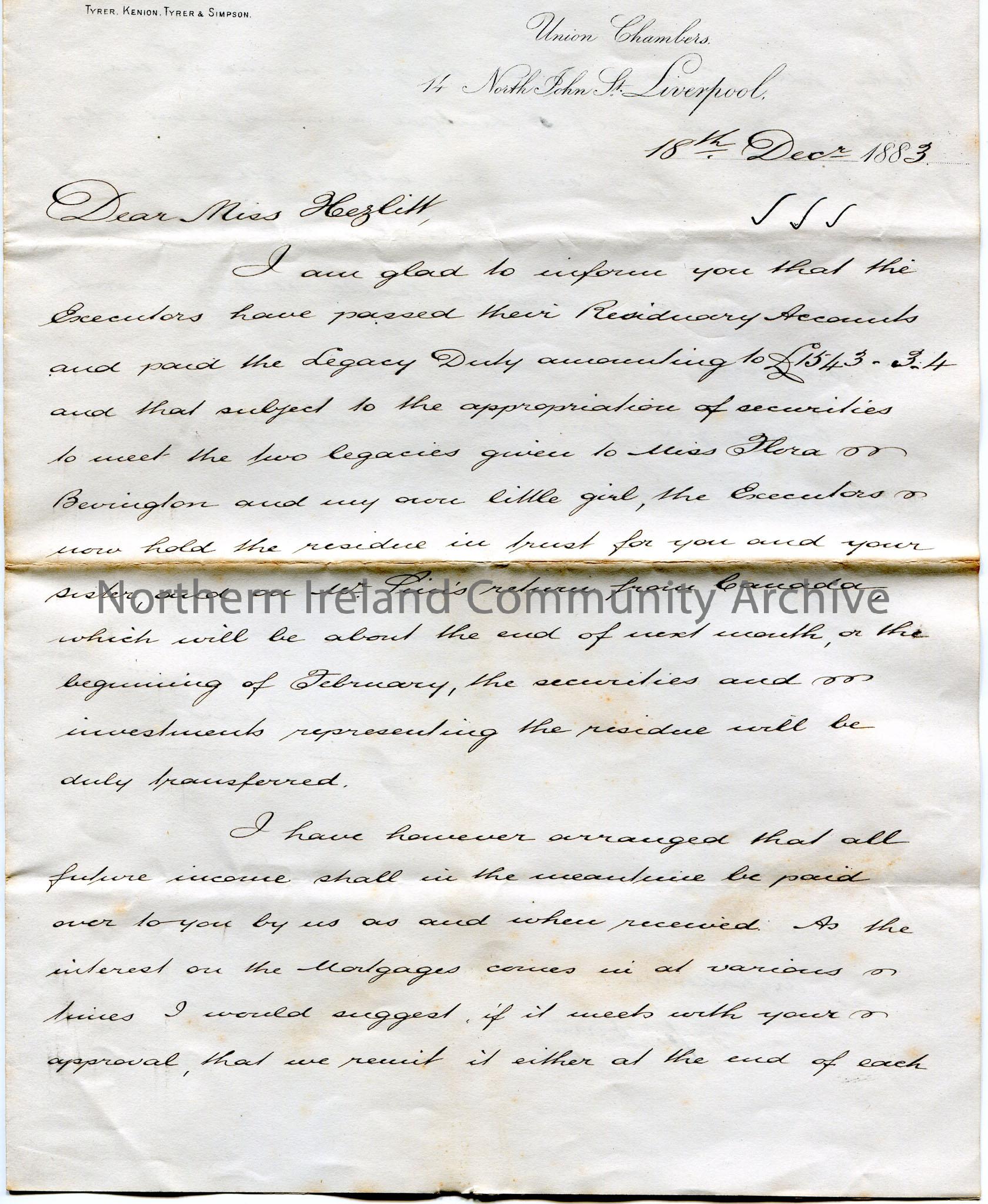 Handwritten letter, double sided and folded, to Miss Hezlet at Bovagh, Aghadowey, Co. Derry. Informs Miss Hezlet that the Executors have passed their Residuary Accounts and paid Legacy Duty of £1543.3.4. Mentions Miss Flora Bevington. The residence is now held in trust for Miss Hezlet and her sister and the securities and investments of the residence will be transferred to them. Details what the residence of the Estate consists of. Comments on the poor health of his wife. Hopes Miss Hezlet and her sister are well.