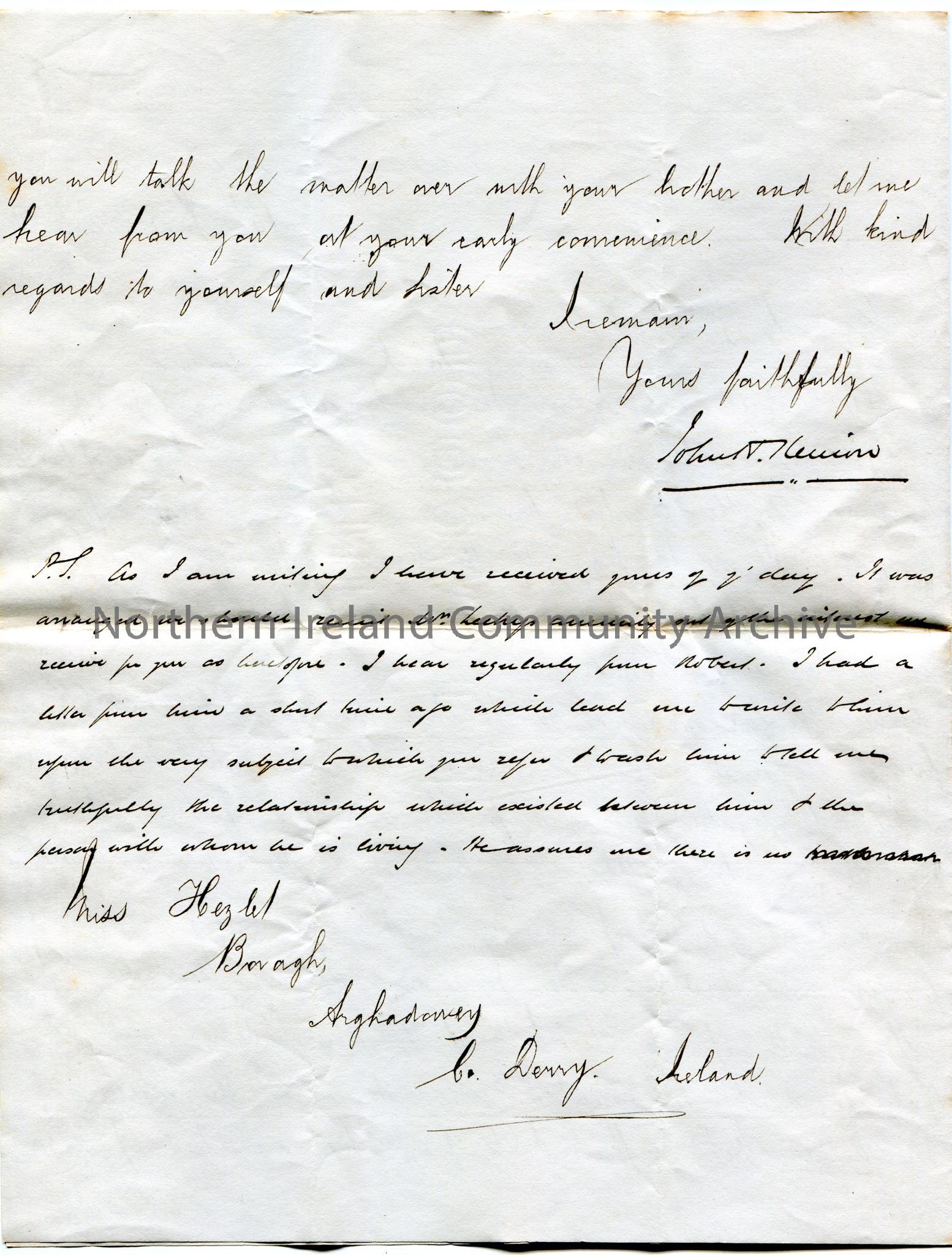 Handwritten letter, double sided and folded, to Miss Hezlet at Bovagh, Aghadowey, Co. Derry, Ireland. Writing re the Will of M. R. Jenkins, deceased. Post Scriptum he writes re Mrs Lecky's annuity. Also writes that he has been writing to Robert to ask for the truth about the person he is living with and to confirm that he has not had 'secret marriage'.
