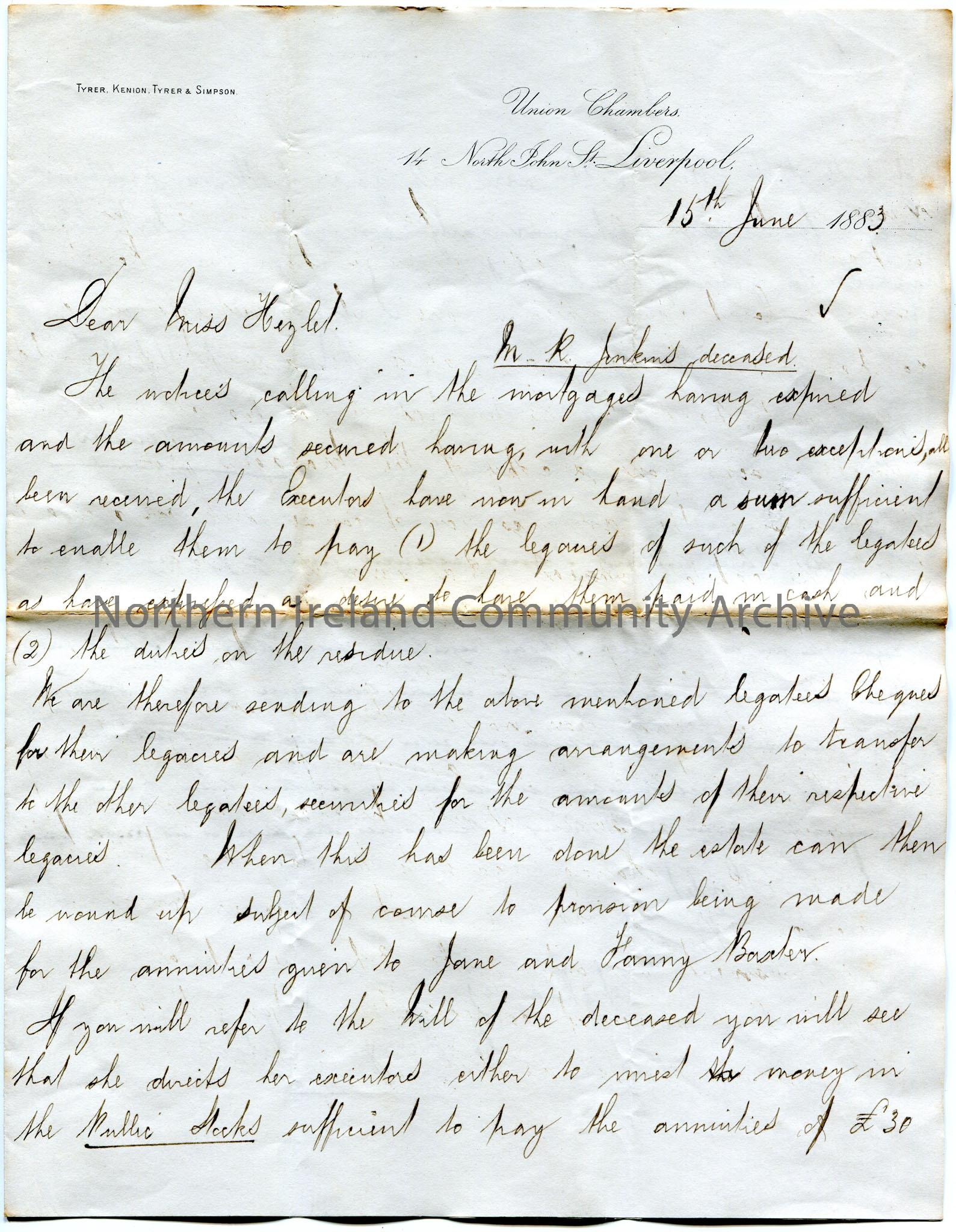 Handwritten letter, double sided and folded, to Miss Hezlet at Bovagh, Aghadowey, Co. Derry, Ireland. Writing re the Will of M. R. Jenkins, deceased. …