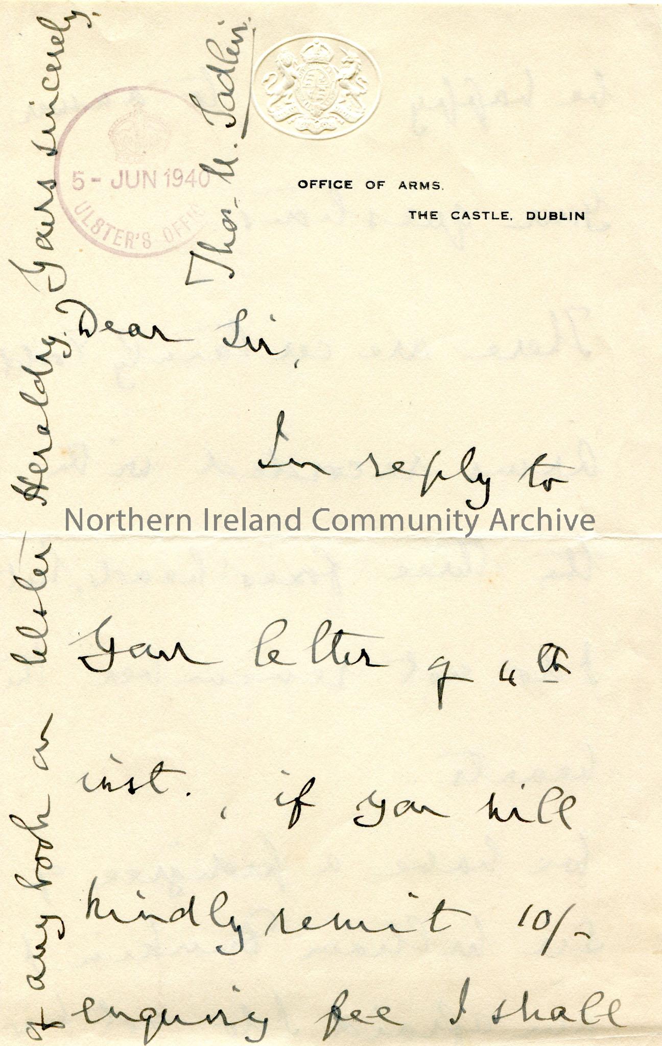 Handwritten letter (double sided) asking for fee to answer questions. Cannot recall the Todd Coat of Arms as having hearts, only fox heads. They have a pedigree of Sir William Dunkin. Cannot recall any book on Ulster Heraldry.