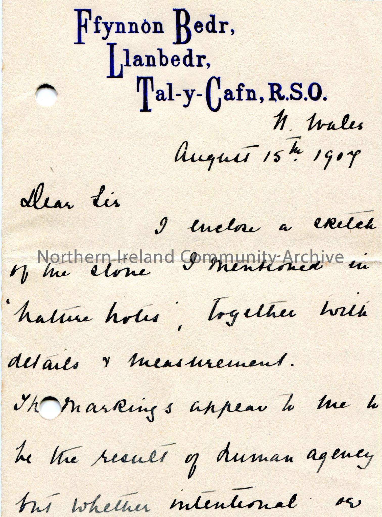 Handwritten letter, double sided, from Angela Brazil. Addressed from Ffynnon Bedr, Llanbedr, Tal-y-Cafn, R.S.O, N. Wales. Dated 15th August, 1907. Encloses a sketch of a stone mentioned in 'Nature Notes'. Writing re the markings on the stone.