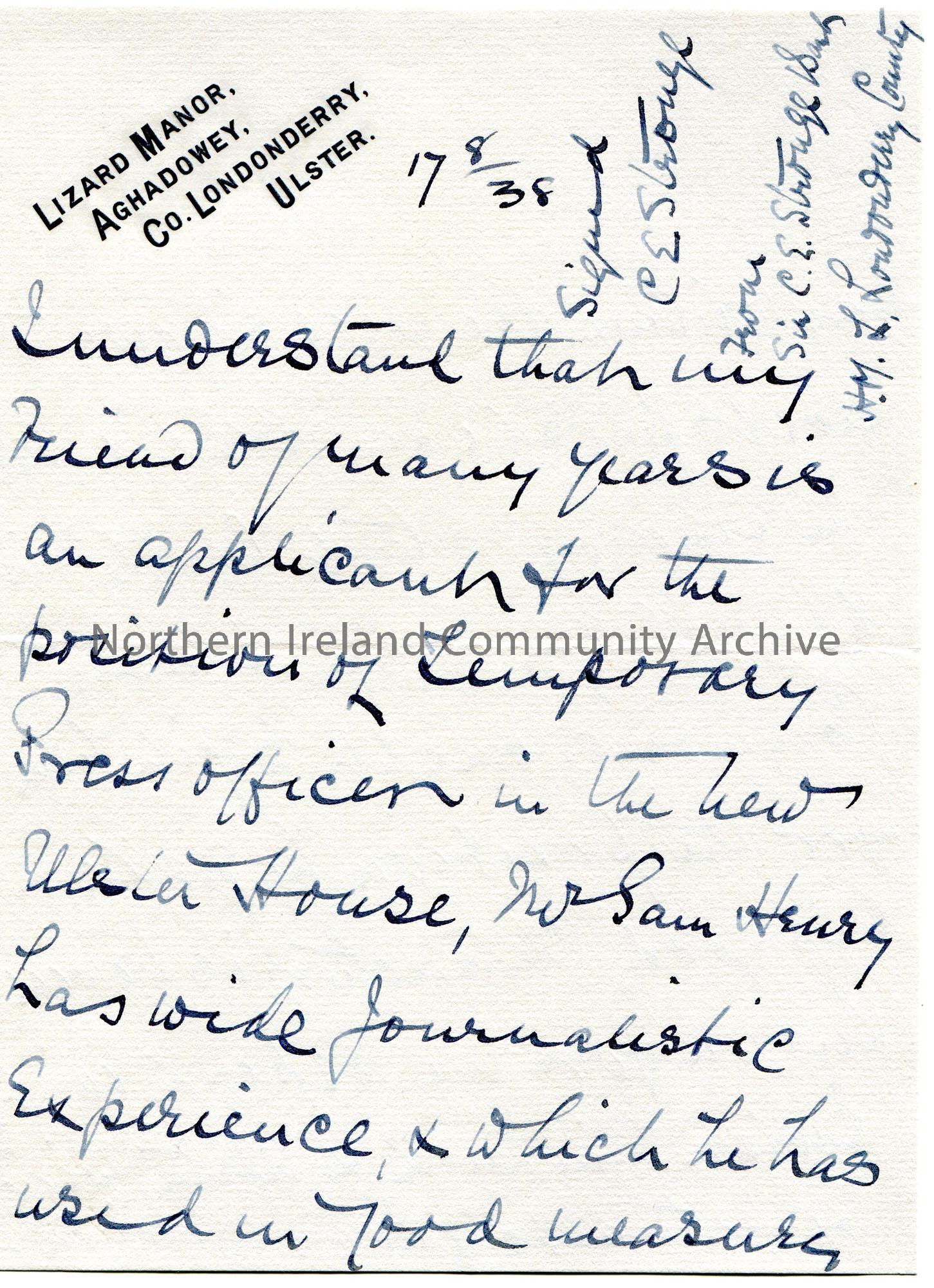 Handwritten letter (double sided). No recipient details given. States his reasons for Sam Henry to be appointed as Temporary Press Officer in the New Ulster House.