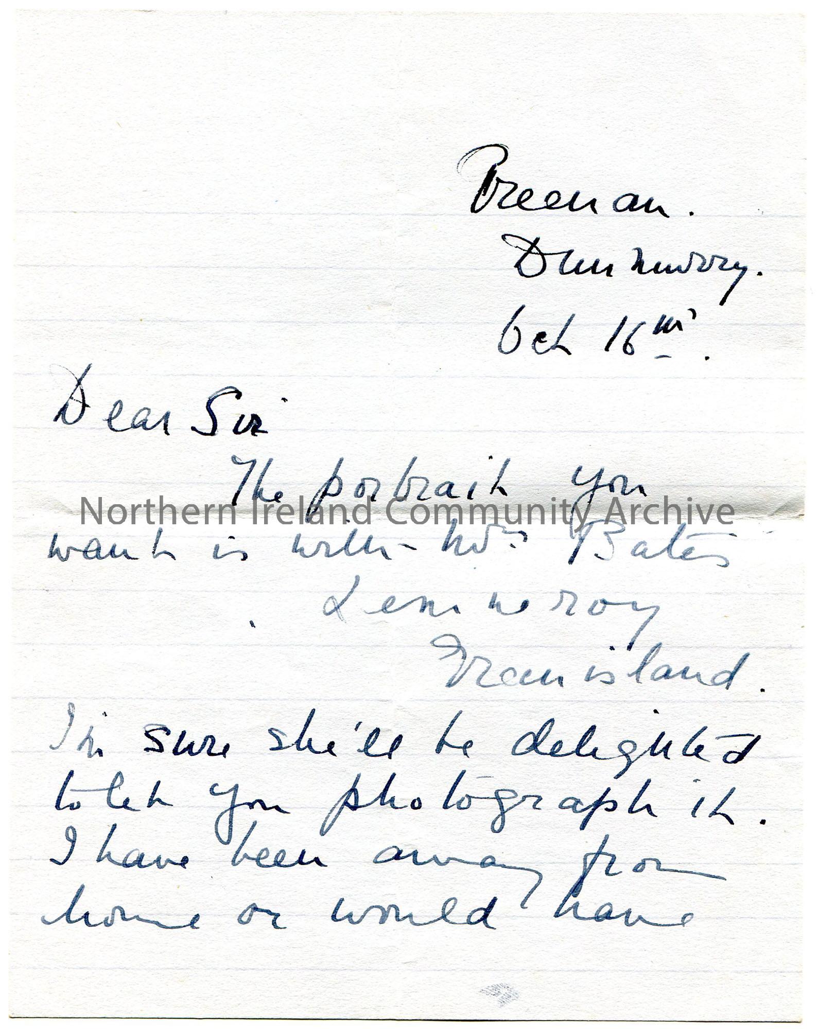 Handwritten letter (double sided) on blue coloured lined paper to ‘Dear Sir’. Informs Sam that the portrait is with Mr Bates.
