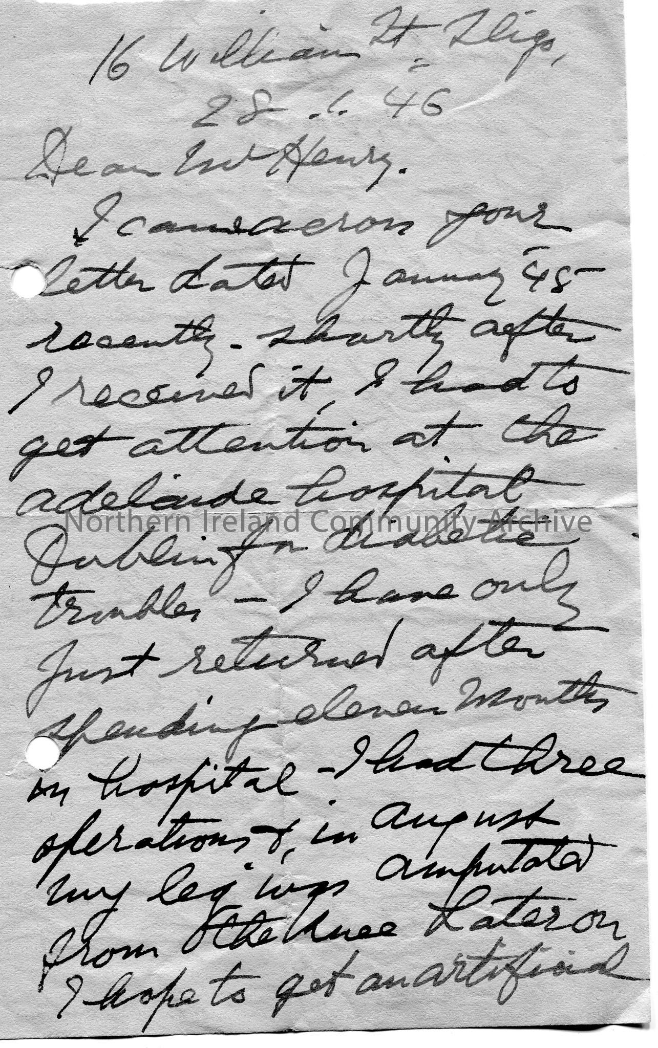 Handwritten letter (double sided) on blue coloured paper to Mr Henry. He had been in the Adelaide Hospital, Dublin for 'diabetic troubles'. His leg was previously amputated from the knee and hopes to get an artificial limb. Asks if Sam has recovered from his illness. He sang Percy French songs to the other patients in the hospital and was told by a nurse to stop. Hopes the 'Rotarians' are 'going strong' in Coleraine.