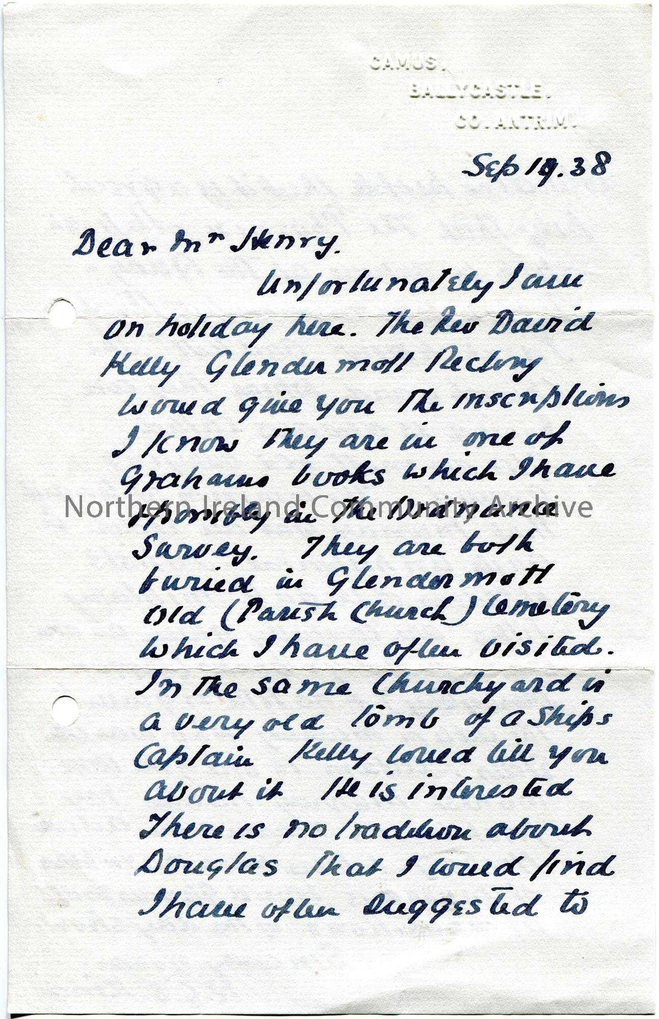 Handwritten letter (double sided on blue paper) to Sam Henry. Refers to Glendermott Parish Church cemetery; Irish ship ‘The Phoenix’; surname Murray.