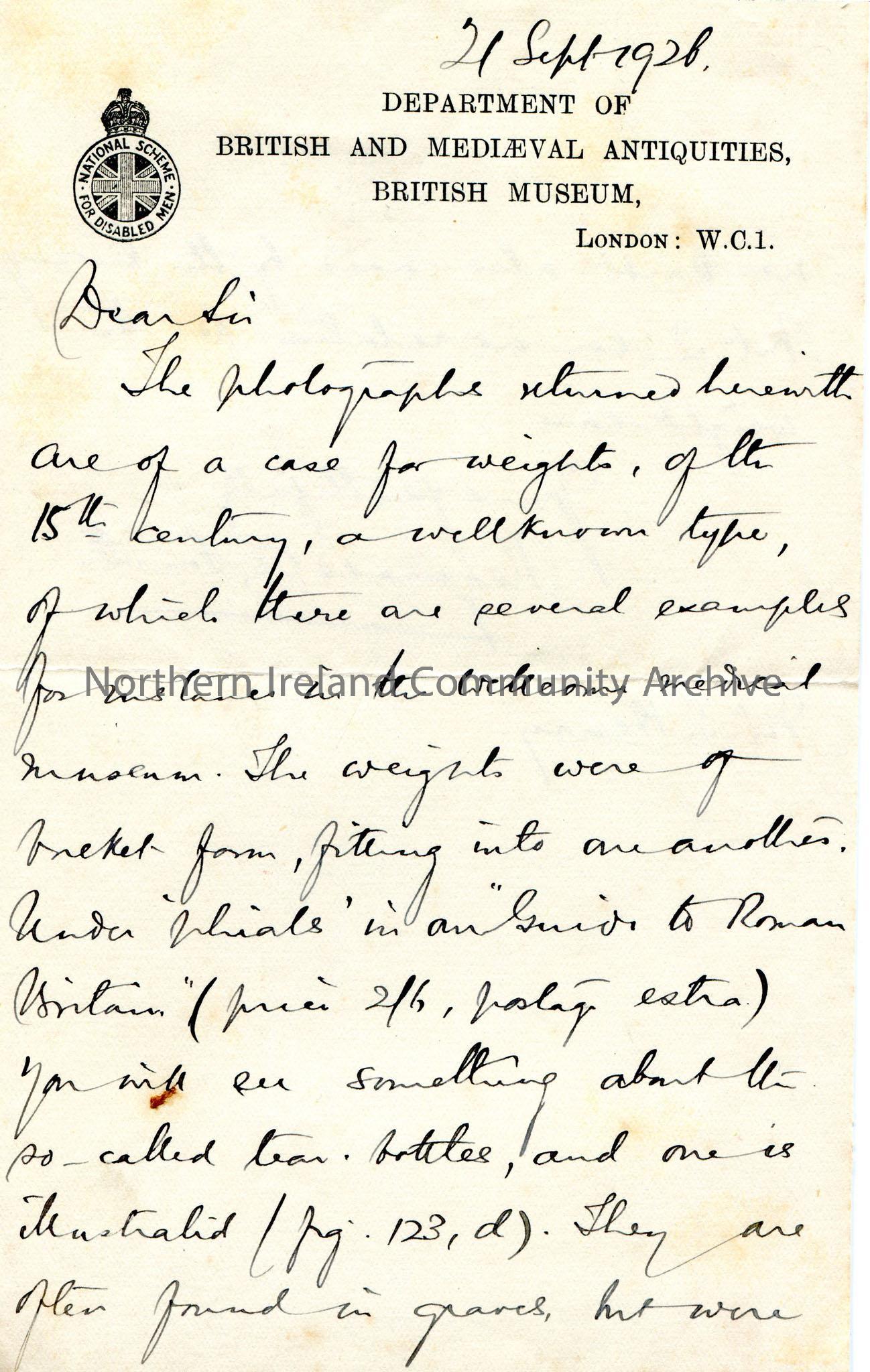 Handwritten letter (double sided) on headed paper to Sam Henry. Returning photograph of a case for weights from the 15th century. Gives an explanation…