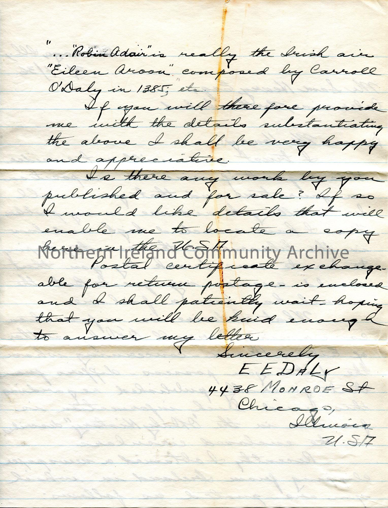 Handwritten letter (double sided) on lined paper to Sam Henry. Asking Sam for more information re the Irish air 'Eileen Aroon' composed by Carroll O'Daly in 1385. Encloses documents re Daly history and postal certificate for return postage.