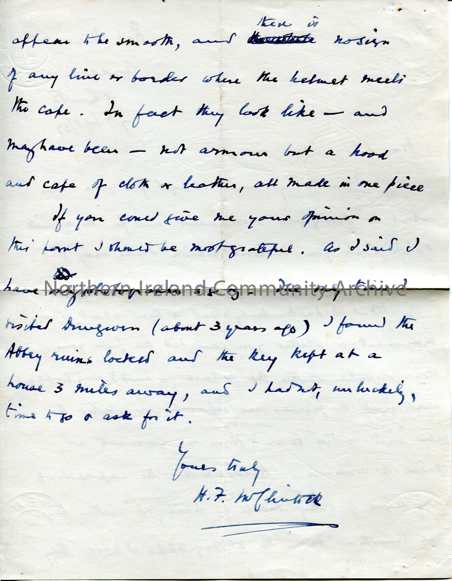 Handwritten letter (double sided pale blue paper) to ‘Dear Sir’. Asks for an opinion on the ‘Cooey’ monument at Dungiven [Priory]. They would like to … – scan026b