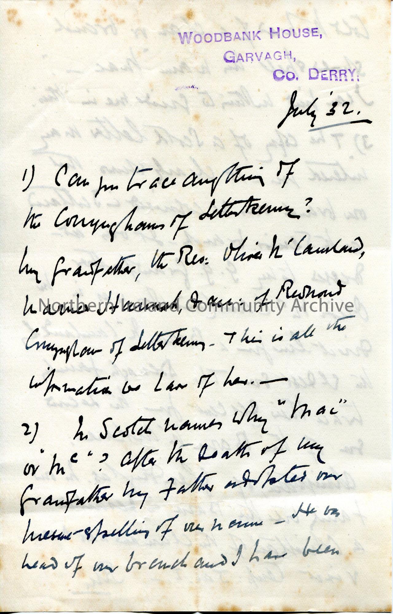 Handwritten letter (double sided). Recipient not named. Writing re the Macausland family. Asks the recipient if they can trace the Conynghams of Letterkenny and why there are variations in the spelling of 'Mc' and 'Mac' in Scotch names.