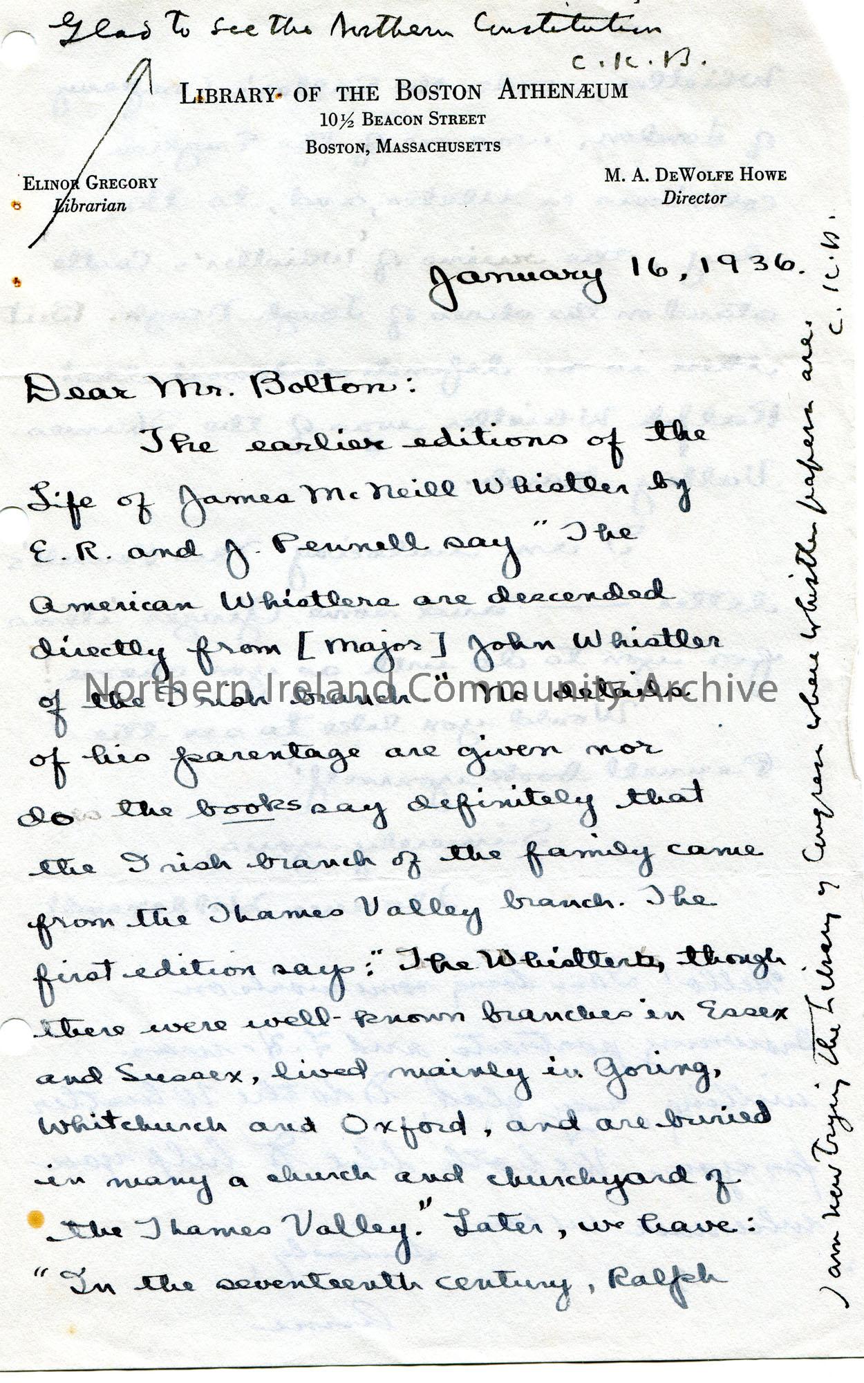 Handwritten letter (double sided) to a Mr Bolton. Writing re genealogy of the Whistler family name with particular reference to James McNeill Whistler and John Whistler. Mentions Ulster, Lough Neagh and Thames Valley. Additional paragraph added by 'Anne' at end of letter re Whistler and willing to help. Other additional notes written on front of letter re Northern Constitution and Library of Congress.