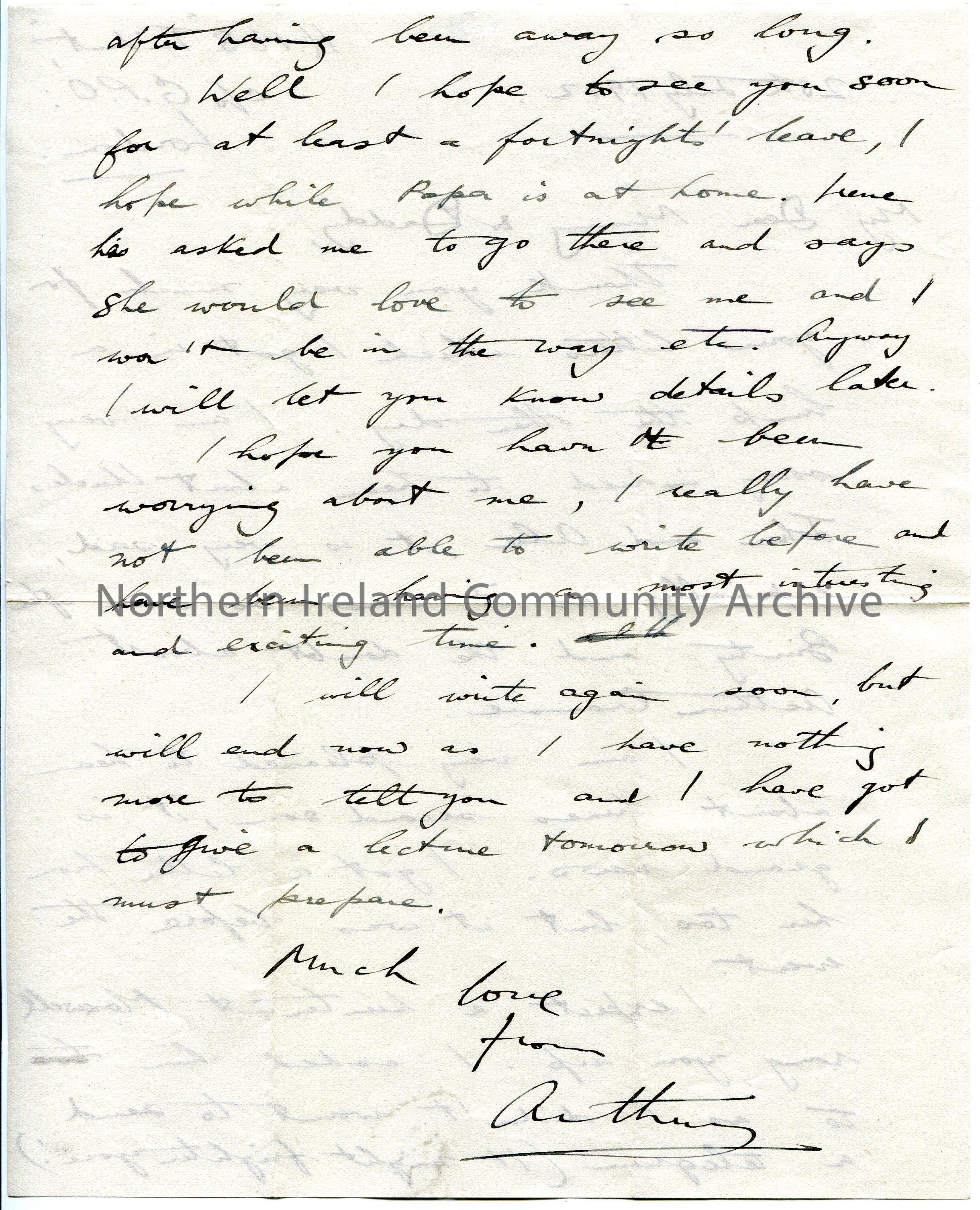 Handwritten letter (double sided) to 'Dear Mummy & Daddy'. Writes that he is sorry to hear about Uncle John and Alec [?], particularly after Bunty [?] and the 'doubt about Arthur Cramsie'. Arthur is pleased to hear about Irene's second son. He had asked Lieutenant Maxwell to ring his parents rather than send a telegram. Hopes to be on leave for 2 weeks and to visits home. Writes that he has a lecture to prepare for tomorrow.