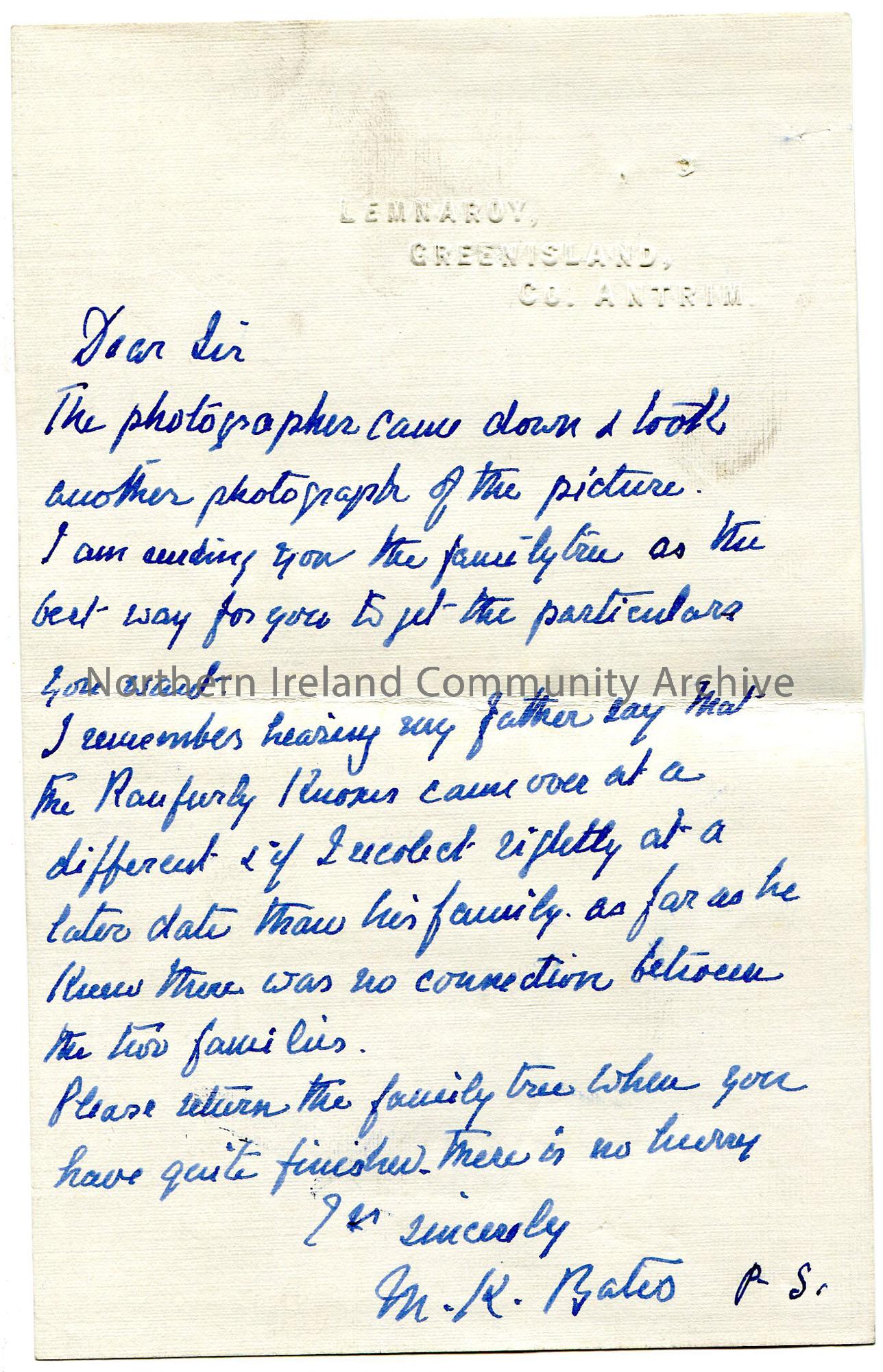 Handwritten letter (double sided) to 'Dear Sir'. Stating that a portrait was photographed by a photographer [of Robert Higginbotham]. Asks Sam to help them find a connection between two families - R? and Knox. Details genealogical information on his grandmother. Asks Sam for a copy of the Coleraine Chronicle 'with your article'.