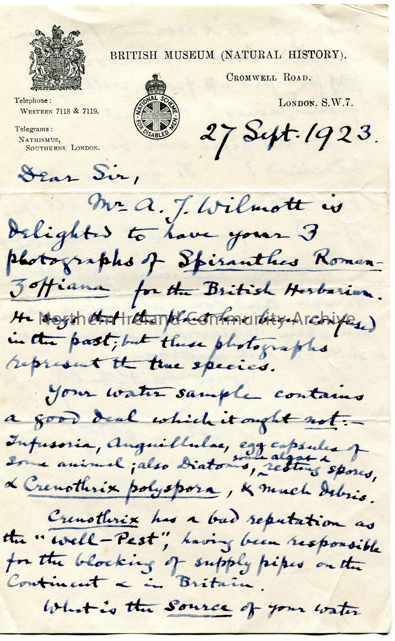 Handwritten letter (double sided) to ‘Dear Sir’. Thanks Sam for his 3 photographs of Spiranthes Romanzoffiana. Tells Sam what is in the water sample h…