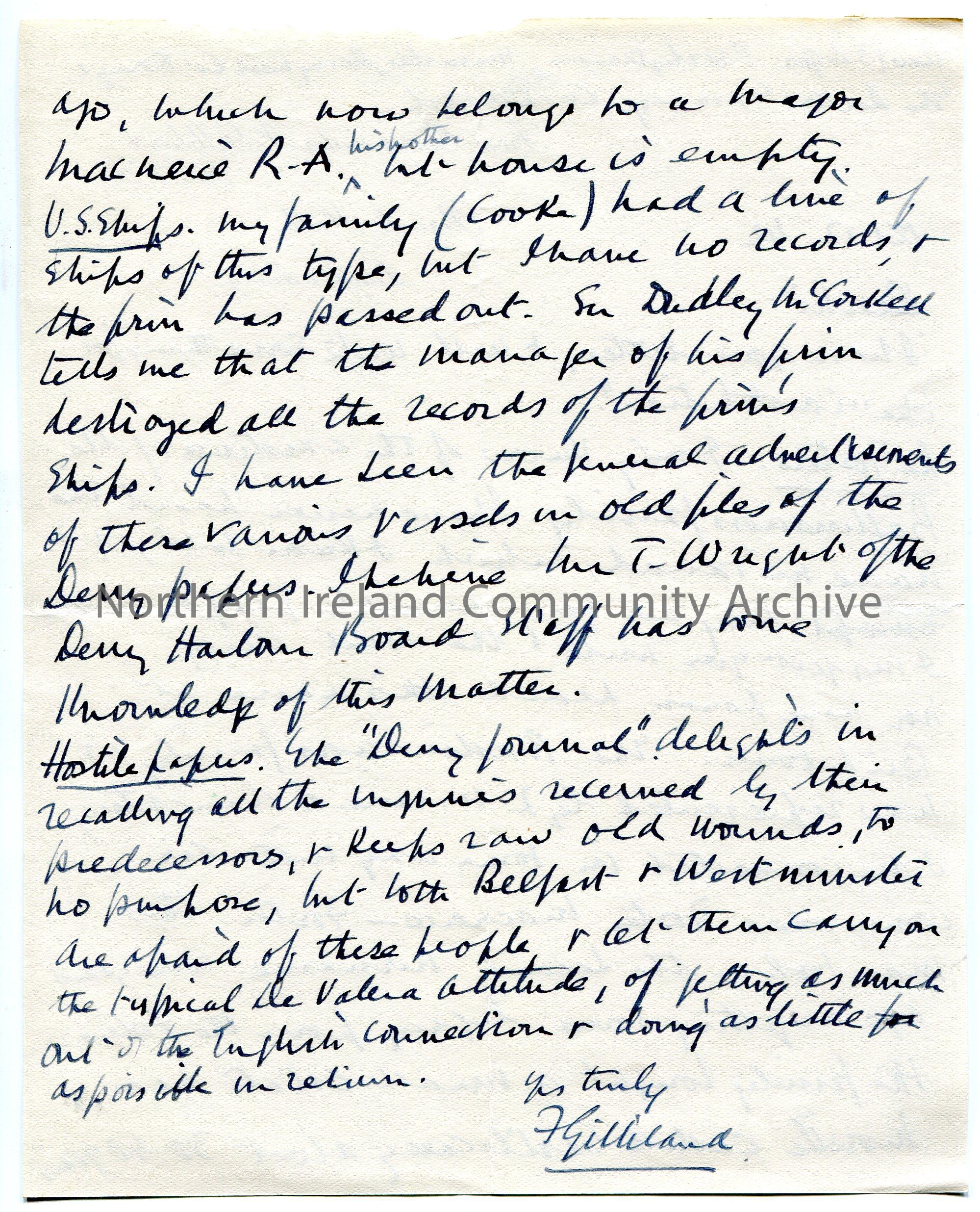 Handwritten letter (double sided) to 'Dear Sir'. Writes that they will write something for the 'Constitution' in response to Sam's letter. Writes re Foster family; U.S ships and Sir Dudley McCorkell's firm; Derry Journal newspaper which they describe as 'hostile' with a 'De Valera attitude' and that 'Belfast and Westminster are afraid of these people'.