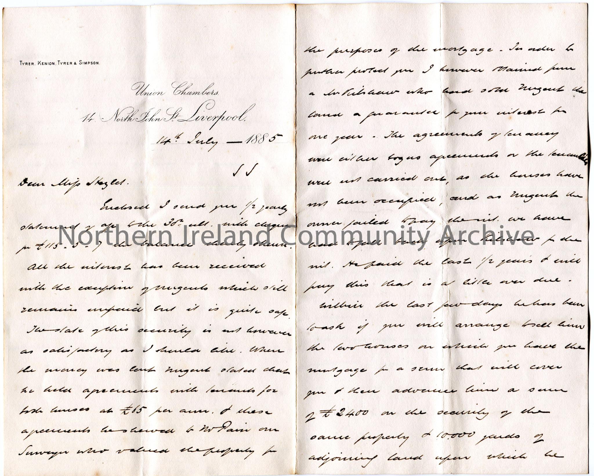 Handwritten letter, double sided, to Miss Hezlet at Bovagh, Aghadowey, Co.Antrim. Encloses half yearly statement of accounts and cheque for £115.5.7. Kenion writes of his concern of the security of the houses re Nugent's mortgage. The houses do not let and there is a proposal to sell the houses. Writes of the interest on the £6000 accrued since Robert's death.