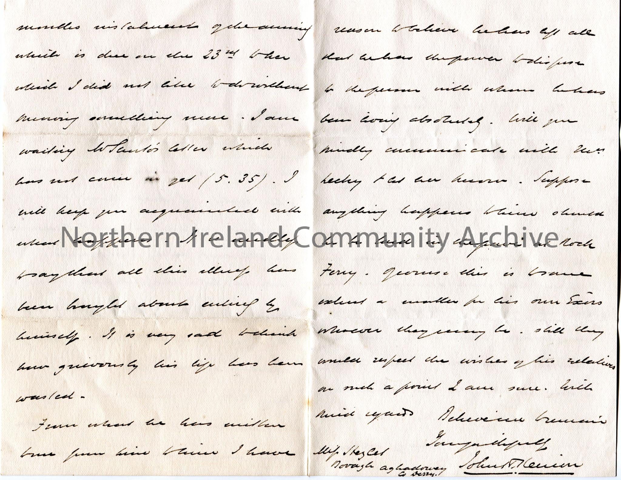 Handwritten letter, double sided, to Miss Hezlet at Bovagh, Aghadowey, Co.Derry. Writes re the failing health of Robert. Miss Hezlet to let Mrs Lecky … – scan393b