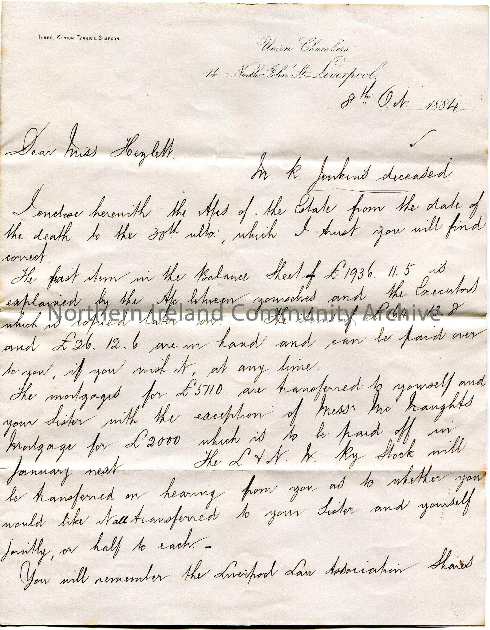 Handwritten letter, double sided, to Miss Hezlet at Bovagh, Aghadowey, Co.Derry. Writing re M. R. Jenkins deceased. Encloses accounts of the Estate. Informs Miss Hezlet of the balance due to herself and her sister. Miss Hezlet to instruct Kenion as to the investment of the Liverpool Law Association Shares. The Mersey Docks and Harbour Board Bonds are being retained for the legacies to Miss Bevington and 'my little girl'.