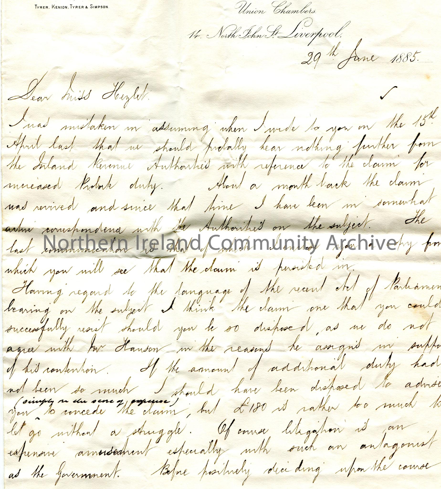 Handwritten letter, double sided, to Miss Hezlet at Bovagh, Aghadowey, Co.Derry. Writing re the Inland Revenue Authorities and increased Probate duty….