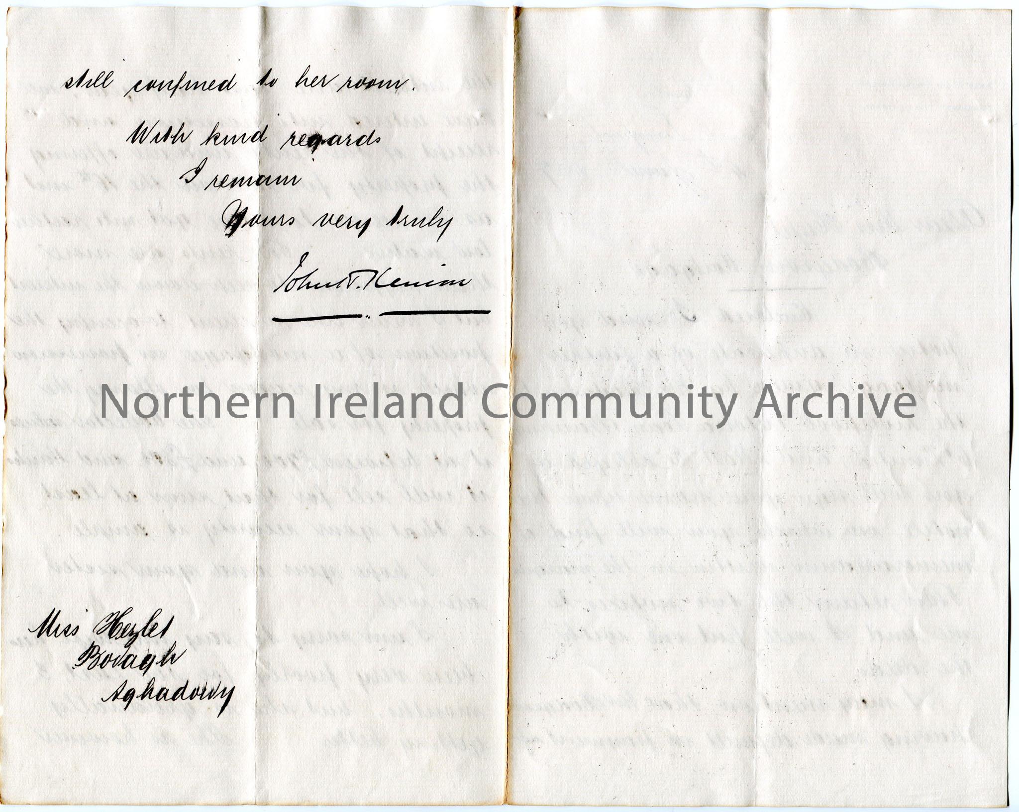 Handwritten letter, double sided, to Miss Hezlet at Bovagh, Aghadowey. Writes re Hodgson’s mortgage. Encloses a notice for a further mortgage by Mr Ho… – scan409b