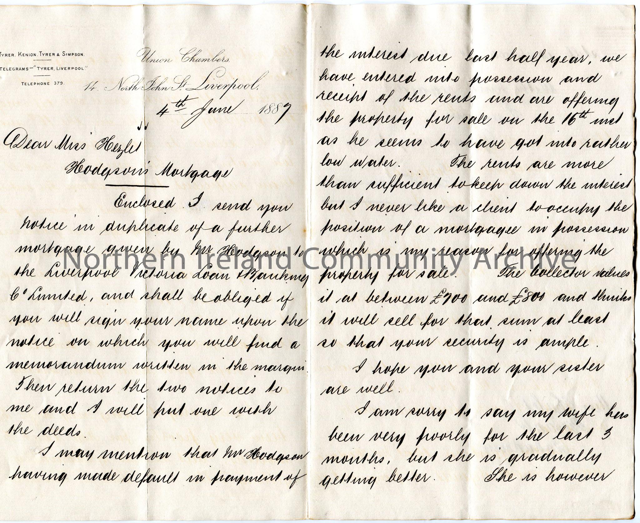 Handwritten letter, double sided, to Miss Hezlet at Bovagh, Aghadowey. Writes re Hodgson's mortgage. Encloses a notice for a further mortgage by Mr Hodgson to the Liverpool Victoria Loan and Banking Company Limited which Miss Hezlet is to sign and return. Informs Miss Hezlet that Mr Hodgson has defaulted in payments and so the property is to be sold and has been valued at between £700-£800. Comments that his wife has been very ill lately.