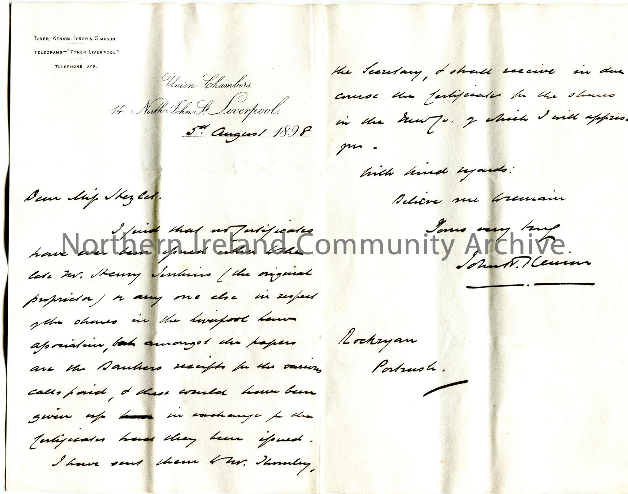 Handwritten letter, double sided, to Miss Hezlet at Rockryan, Portrush. Re certificates and shares.