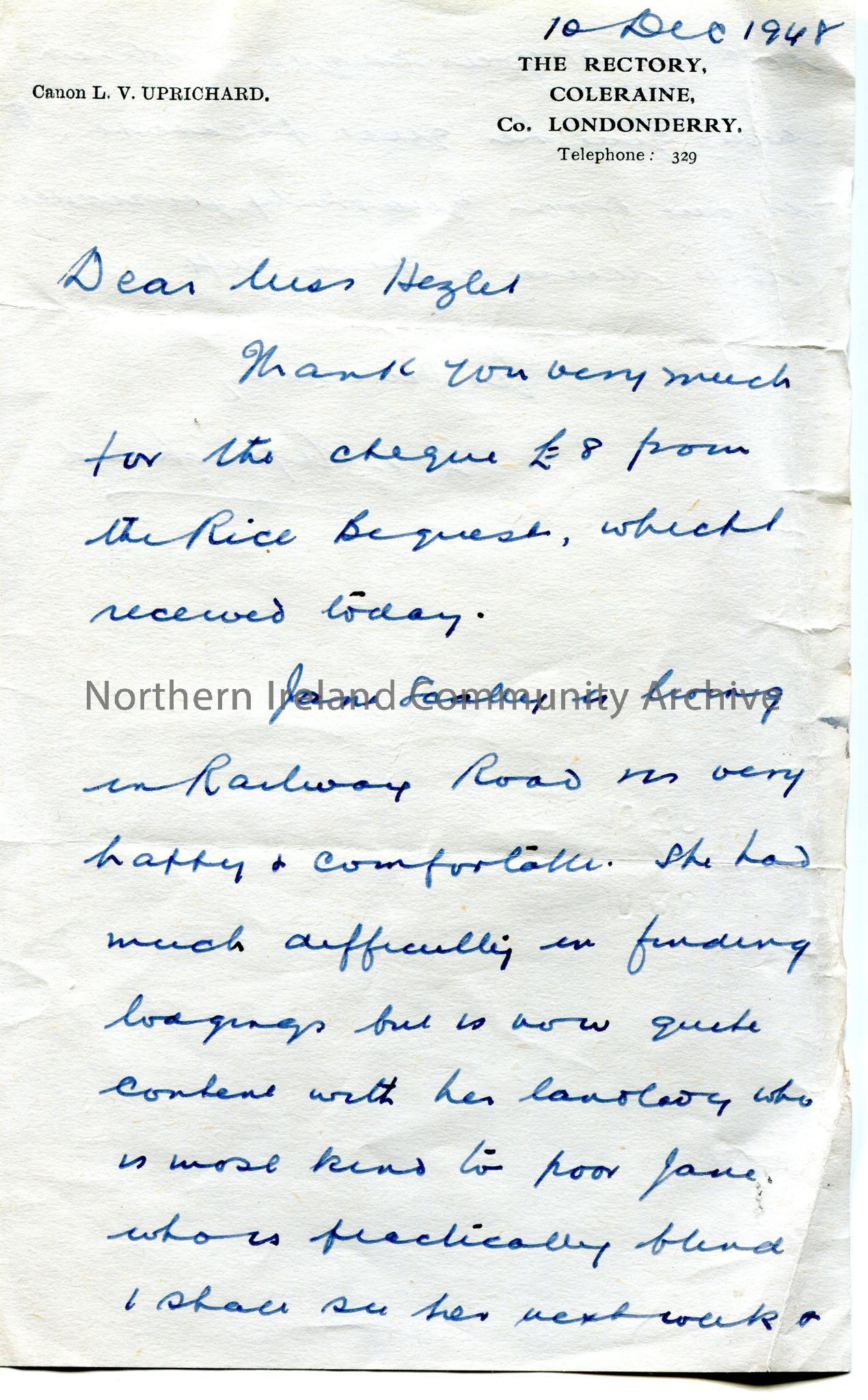 Handwritten letter, double sided, to Miss Hezlet. Thanks Miss Hezlet for cheque for £8 from the Rice Bequest. Writes that Jane Foalley? is now living on Railway Road and is happy and comfortable in her new lodgings.